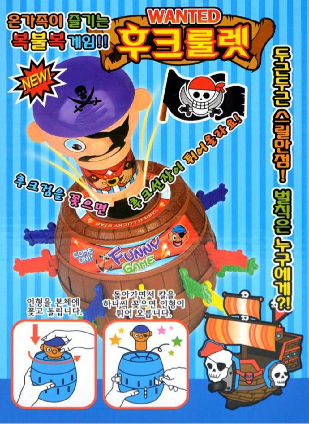 '해적룰렛 게임'이라는 보드게임이 있다. 작은 통에 해적이 들어가서 머리만 내놓고 있는 모양인데, 통을 빙 둘러 스무 개 정도 작은 구멍이 나란히 뚫려있다. 게임이 시작되면 참가자들이 번갈아가며 구멍에 플라스틱 칼을 하나씩 꽂아 넣는다. 그 구멍 중 하나는 해적과 스프링 장치로 연결이 되어있어, 그곳에 칼을 꽂으면 해적이 펑 튀어 오르도록 되어있다. 그게 어느 구멍인지 게임 참가자 누구도 알 수 없다는 것이 이 게임의 묘미다.