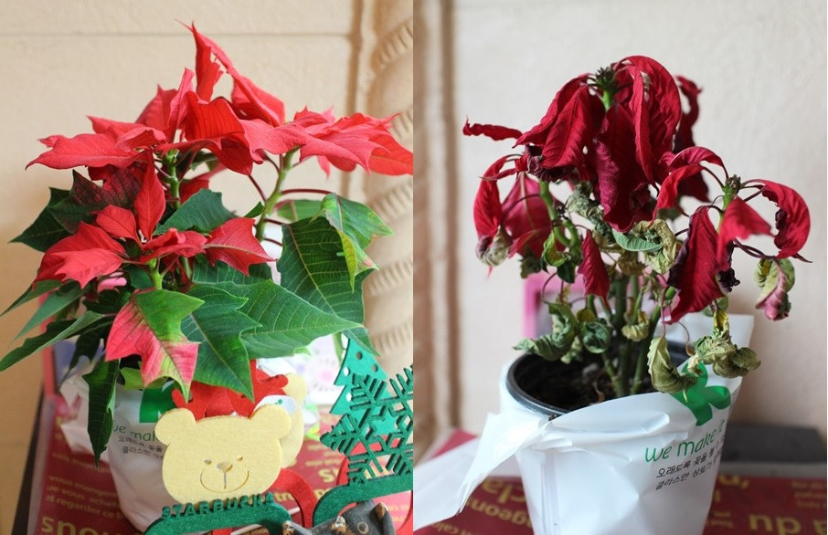 "어 이렇게 시들었네." 바라보니 아내가 시든 포인세티아 화분을 들고 있다. 아차 싶었다. 작년 연말에 거실 트리 옆에 두었던포인세티아. 붉은 잎이 크리스마스와 잘 어울려 매년 연말에 사 오면초록잎으로 변할 때까지 잘 키우곤 했었다. 그런데 올해는 뭐가 바빴는지 물 주는 것을 한참 잊었다.바싹 마른 잎을 보며, 같이 있으면서도 미처 돌보지 못한미안함과후회가 밀려왔다.