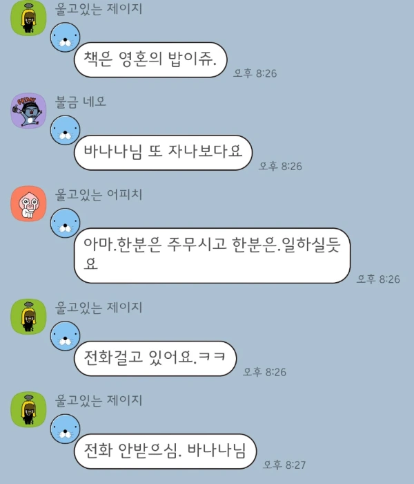바나나도 별명이지만 별명의 별명도 있다. 프랑스어 배운다며 자기를 'Banane(바난느)'로 불러달라고 한 것 말고는 우리가 부르는 별명인데, 그중에 하나는 '믿거바'다. 매월 각자 책 한 권씩 추천하고 그중에서 골라 같이 읽는 모임에서 바나나가 추천한 책은 보통 제목과 표지, 작가 설명이 바나나 향처럼 달콤했다. 그런데 막상 뽑혀서 읽어보면 난해하거나 기대와 너무 달랐고, 점차 바나나의 추천은 우리에게 '믿고 거르는 바나나'가 되었다. 그래도 바나나는 꿋꿋하게 다음에는 정말 좋은 책을 골라 오겠다 했고, 우리는 매번 속으면서도 홀린 듯 바나나 추천 책을 선택하곤 했다.