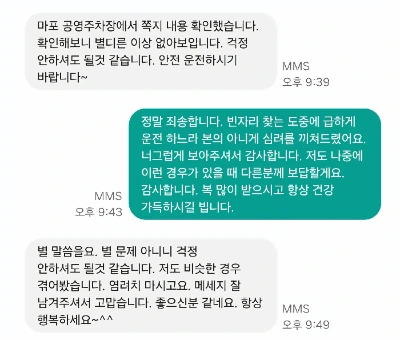 지인들과 같이 저녁으로 고기를 구워 먹으면서도 전화기에 계속 신경이 쓰였다. 차 주인은 뭐라고 하려나, 내 기준은 살짝인데 차주는 그렇게 생각하지 않겠지, 보험 처리는 어쩌지, 아 오늘은 뭐 이러냐 등등 복잡한 생각을 하느라 고기를 몇 점 태워먹었던가. 한참 지나 메시지가 도착했다. 차주로부터의 메시지였다. 메모 발견하고 살펴보니 별다른 이상 없어 보여 괜찮다고 했다. 걱정 말라는 말과 함께 안전 운전하시라는 덕담도 덧붙여 있었다. 고마웠다.