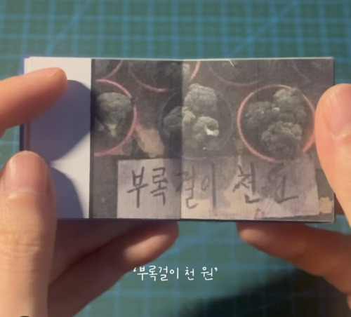 그러다가 어느 그림책 작가가 이 책을 읽고 만들어 올린 영상을 우연히 보게 되었다. 덕원 씨의 북토크에 선물로 가져가려 만들었다는, 손바닥보다 작은 사진책을 넘기는 영상이었다. 페이지마다 시장 할머니들이 브로콜리를 팔며 종잇조각에 적어놓은 이름이 담겨있었다. 브루쿠리, 불로케리, 부록걸이, 보리꼬리, 브로커... 서양에서 건너온 채소 이름이 낯선 어르신들이 정성껏 적어놓은 글씨가 무척 정겨웠다. 사진책 제목은 <너마저 브로콜리>였다.