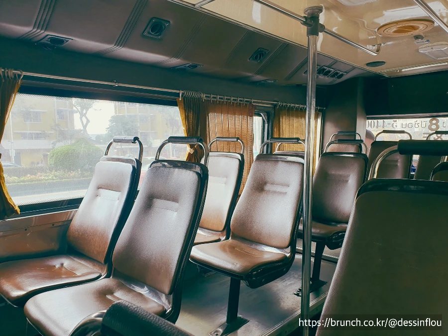 그날의 버스는 빨간색에 녹색 줄무늬였는데. 지금 오는 버스는 주황색이다. 순간 이 버스가 내가 타야 하는 그 버스가 맞는 건가? 의문이 들었다. 하지만 그냥 탔다. 버스 정류장의 뜨거운 햇볕을 일단 피하고 싶었고, 제대로 탔는지 아닌지는 버스 안내원에게 물어보면 되니깐. 아니라고 하면 내리면 된다.