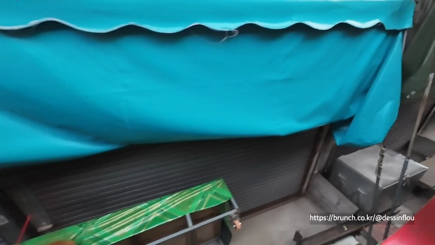 가게의 셔터는 모두 닫혀 있었고, 알록달록한 햇볕 가림막은 모두 접혀 있다.