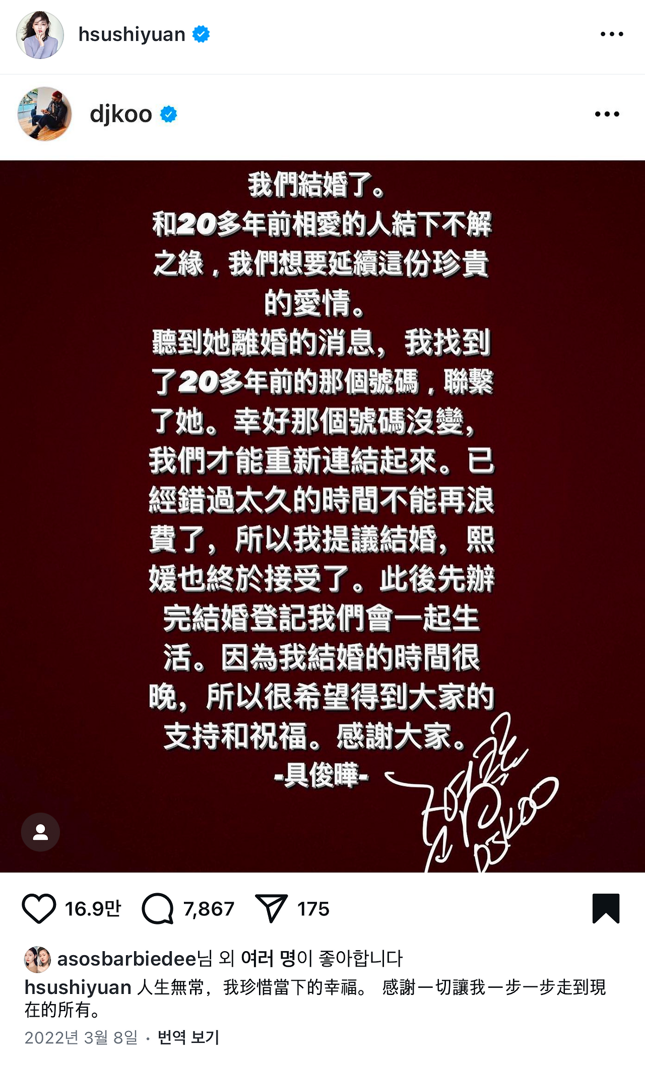 코로나로 국경이 닫힌 와중에 혼인신고부터 먼저 하고 대만으로 향했던 구준엽 영상을 본 적이 있다.