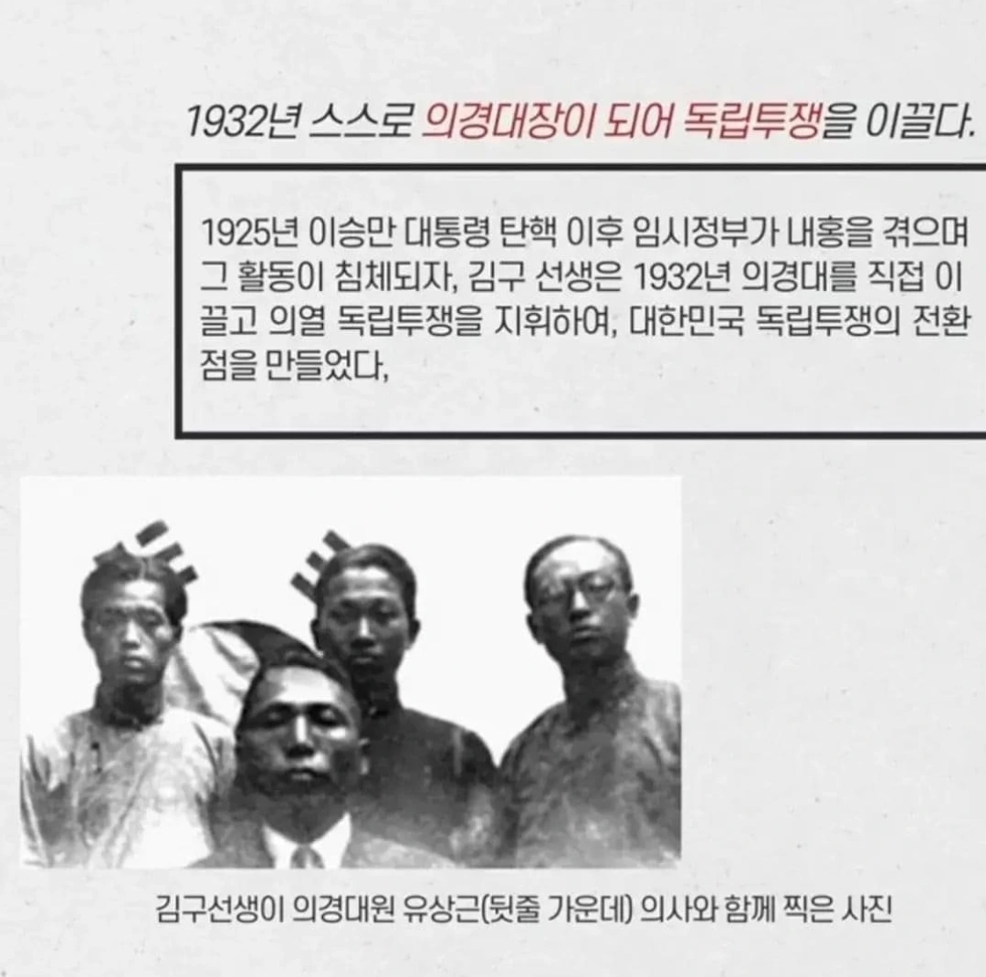 1925년 이승만 대통령 탄핵 이후 임시정부가 내홍을 겪으며 그 활동이 침체되자, 김구 선생은 1932년 의경대를 직접 이끌고 의열 독립투쟁을 지휘하여, 대한민국 독립투쟁의 전환점을 만들었습니다.