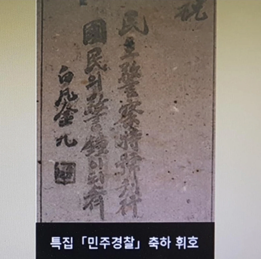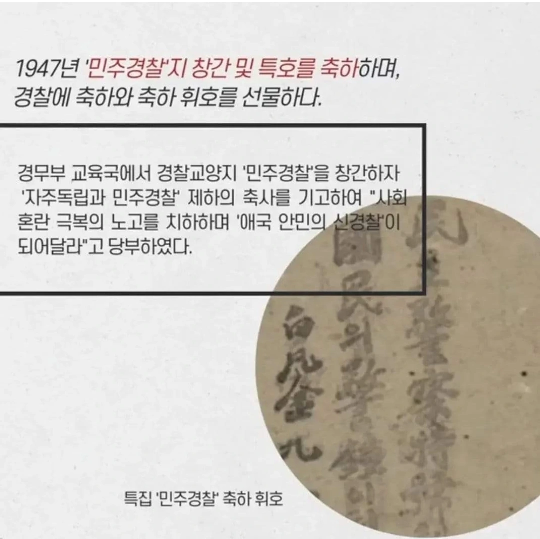'1947년 '민주경찰'지 창간 및 특호를 출간하며, 경찰에 축사와 축하 휘호를 선물하다.'
