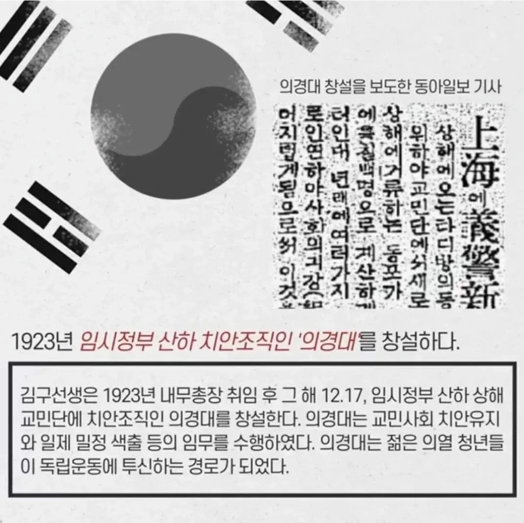 김구 선생은 1923년 내무총장 취임 후 그 해 12. 17, 임시정부 산하 상해 교민단에 치안조직인 의경대를 창설하였고, 의경대는 교민사회 치안유지와 일제 밀정 색출 등의 임무를 수행하였습니다. 의경대는 젊은 의열 청년들이 독립운동에 투신하는 경로가 되었습니다.