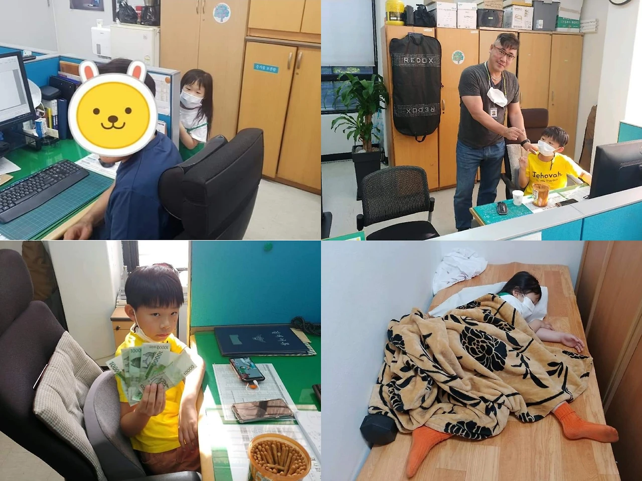 저 역시도 맞벌이라 저와 와이프 둘 다 출근을 해야 하는 경우가 간혹 생기는데... 급히 수배를 해도 얘들을 봐줄 사람을 못 찾으면 어쩔 수 없이 얘들을 데리고 사무실에 갑니다.