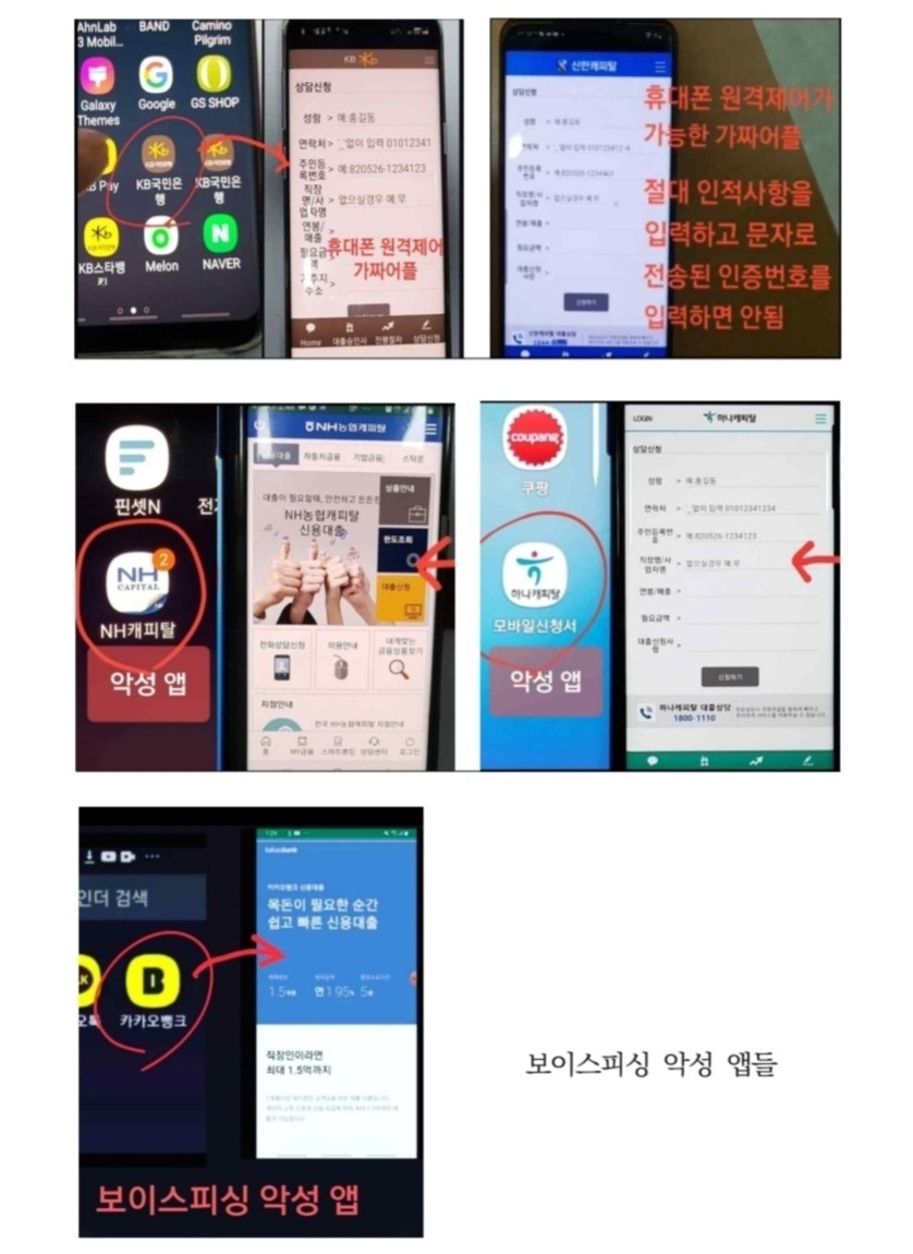 그리고 보이스피싱 조직의 구성원 또는 블랙해커가 만들어, 피해자의 휴대폰에 설치하게끔 하는 사진과 유사한 가짜 앱(악성 앱)을 휴대폰에 절대로 설치하시면 안 됩니다.