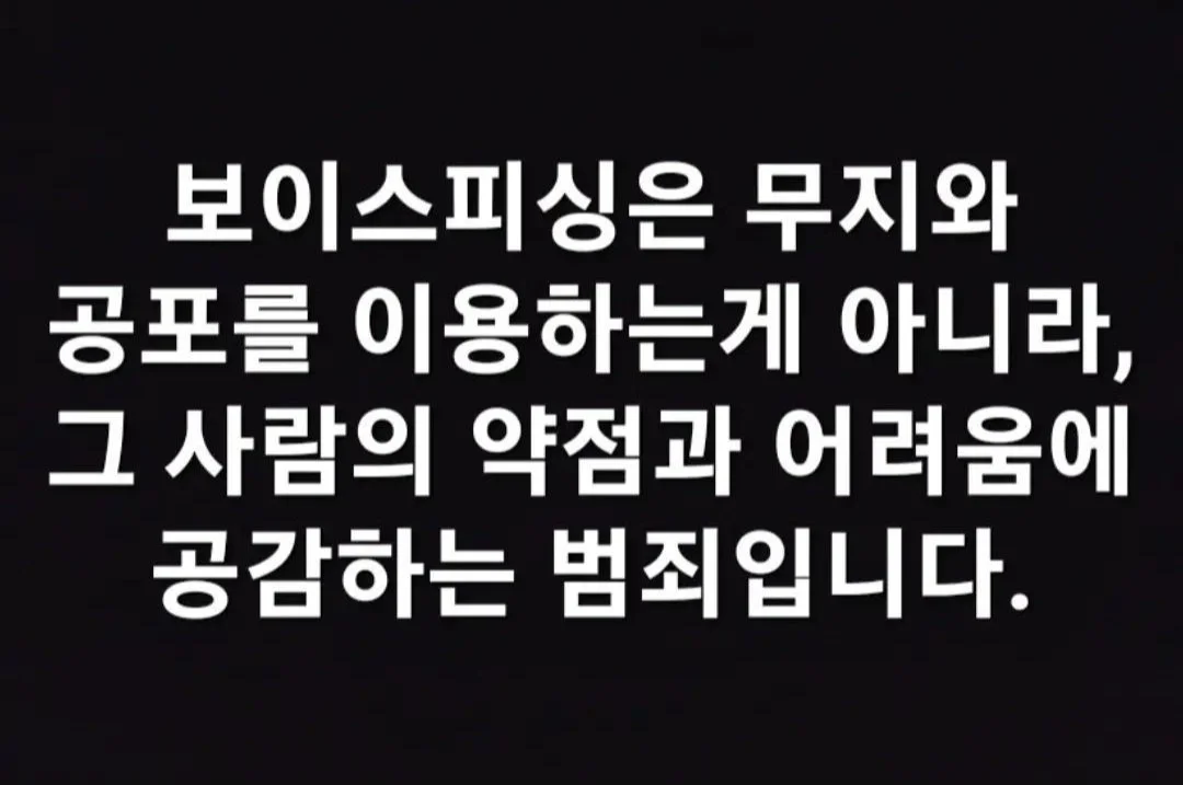 보이스피싱은 사람의 무지와 공포를 이용하는 게 아니라, 그 사람의 약점과 어려움에 공감하는 지능범죄입니다. 그래서 법조인과 고지식층도 피해를 당하고 있습니다. 피해를 보신 분은 절대 자신을 자책하지 않으셔도 됩니다.