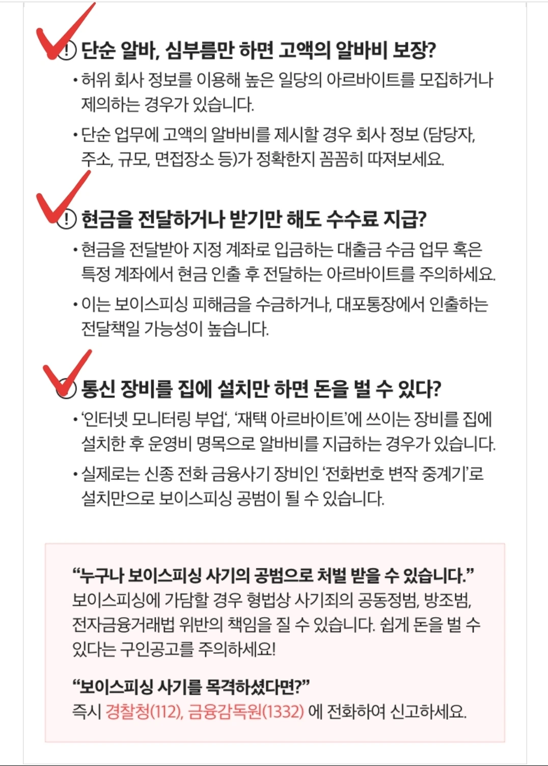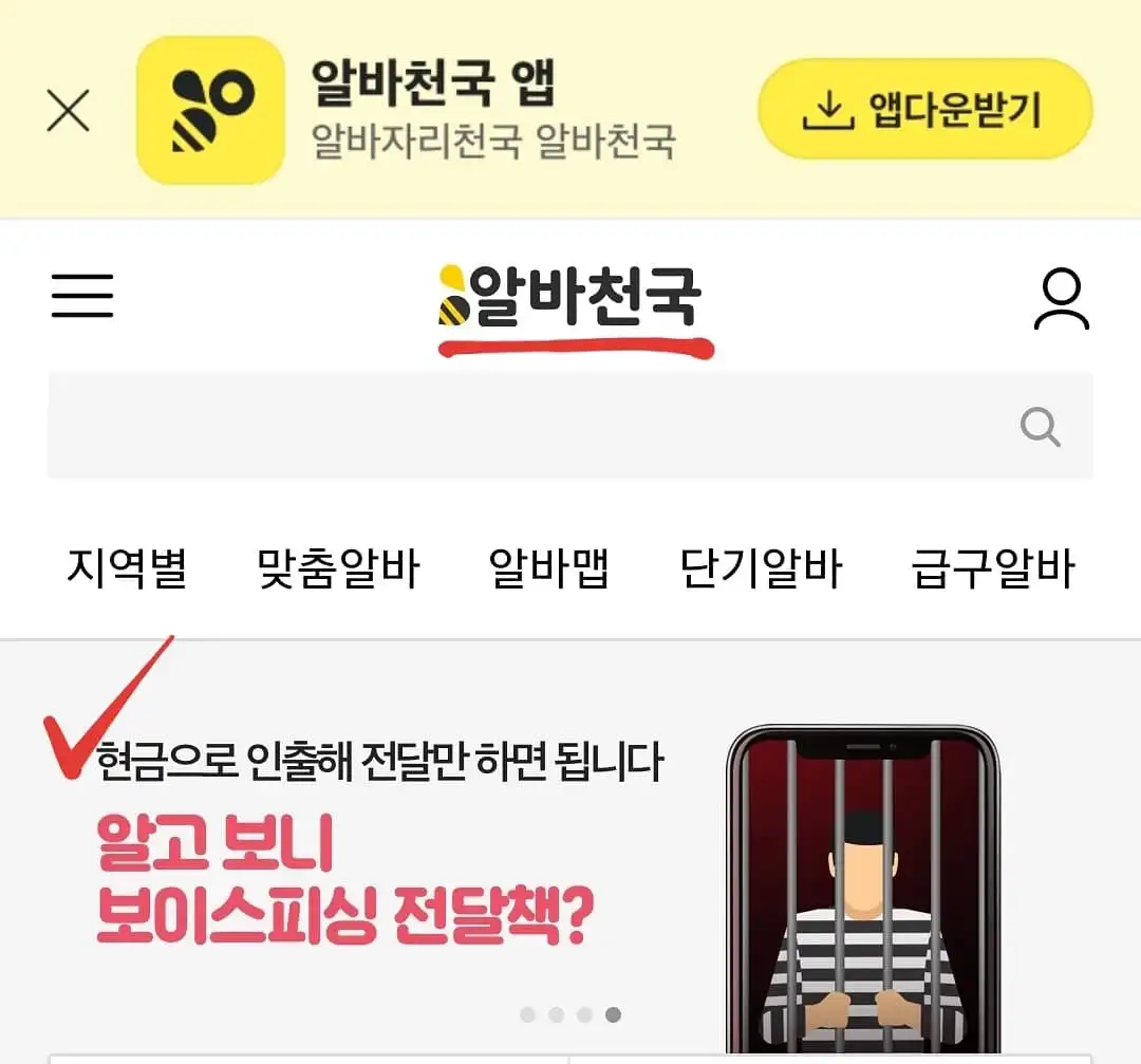 알바천국 웹의 보이스피싱 예방 문구(1)