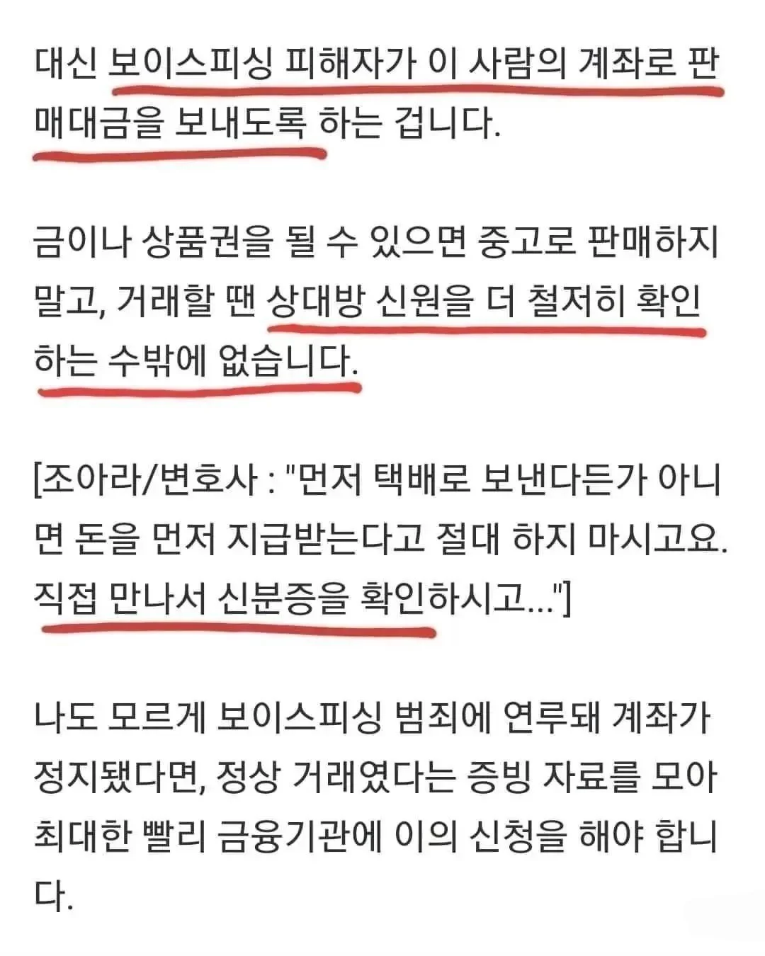 고가의 물품은 개인간 직거래를 가급적 피하고, 부득이 직거래를 해야한다면 돈을 보낸 사람과 물건을 가지러 온 사람의 철저한 신원 확인이 필요합니다.