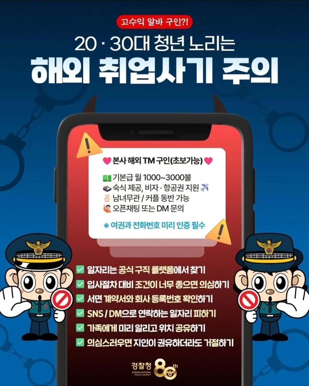 #국민 #경찰 #소통 #강력계 #강력팀 #피싱팀 #형사 #보이스피싱 #메신저피싱 #몸캠피싱 #스미싱 #피싱 #취업사기 #해외취업사기 #경찰 #납치감금 #사기 #예방