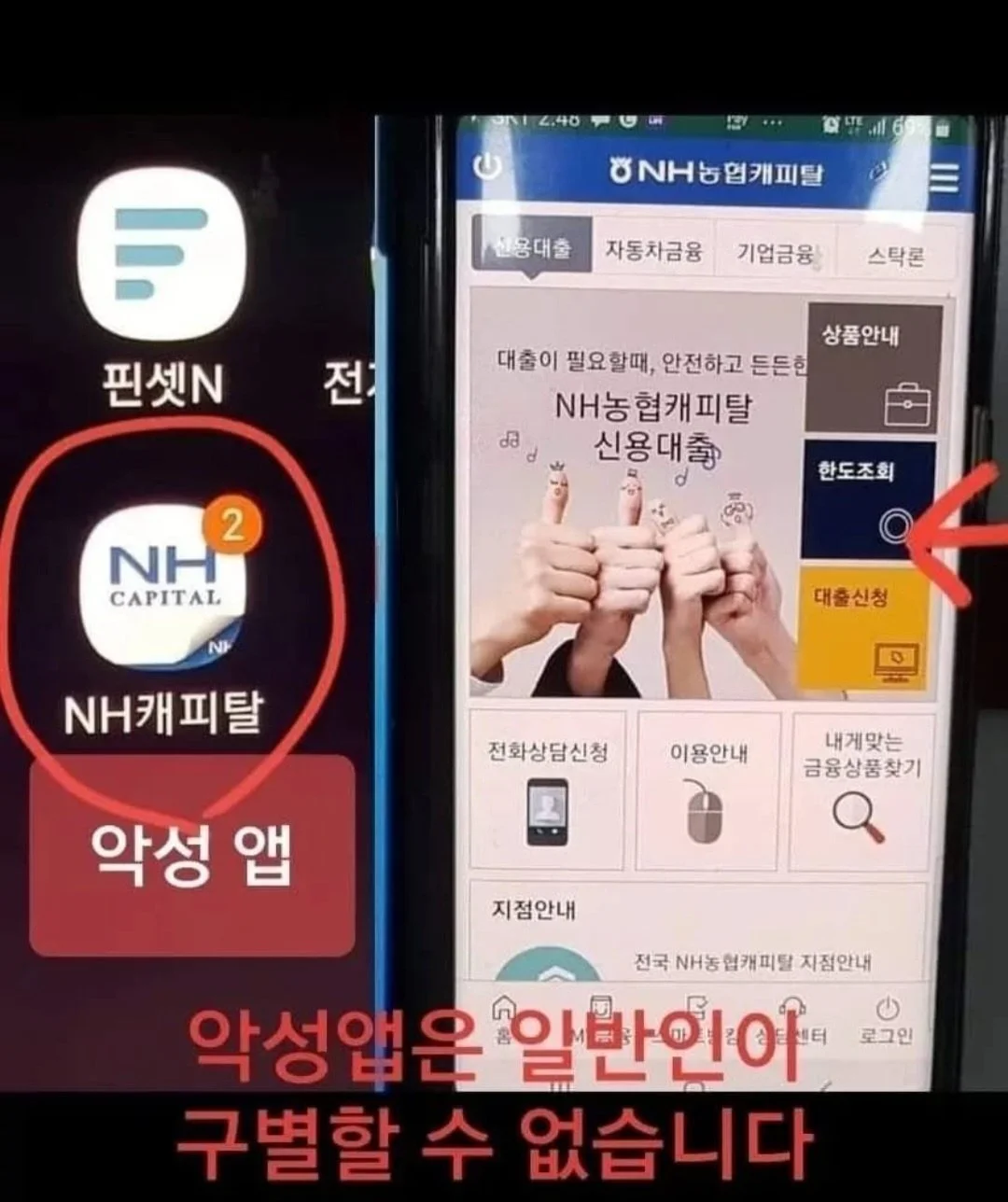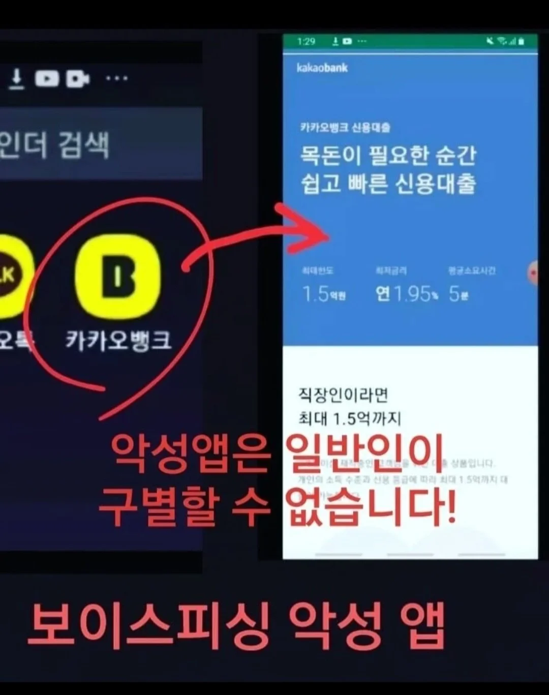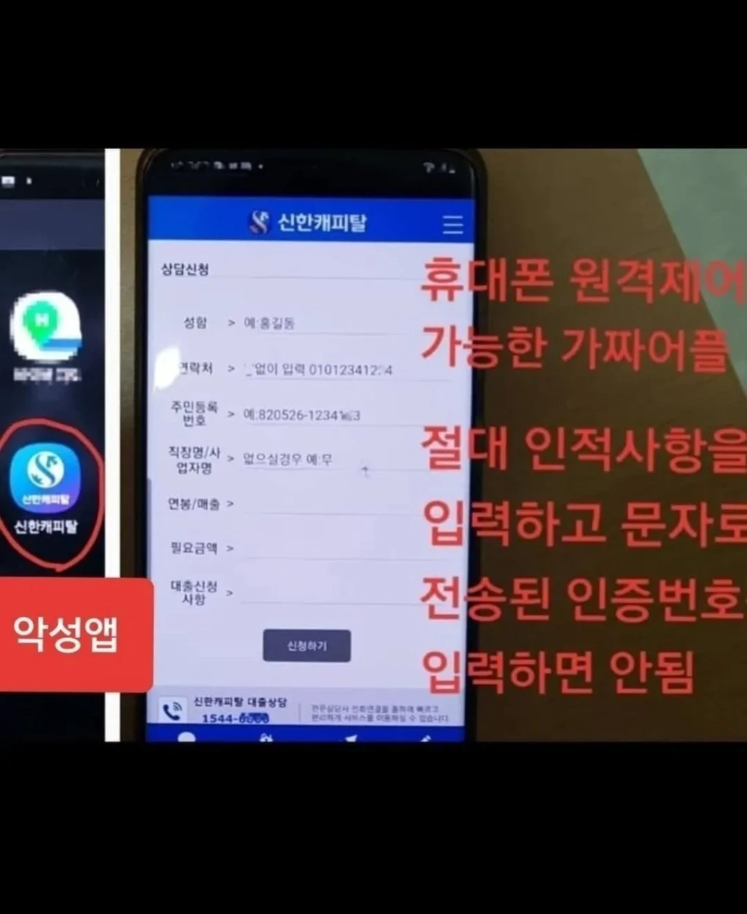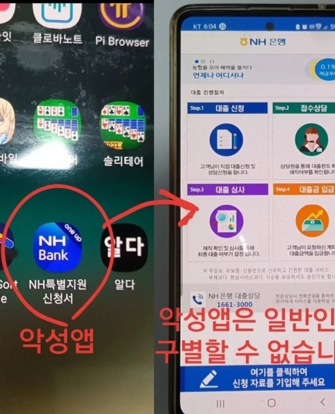 그리고 보이스피싱 범죄 조직의 구성원 또는 고용된 블랙해커가 만들어, 피해자의 휴대폰에 설치하게끔 하는 사진과 유사한 가짜 어플(악성 앱)을 휴대폰에 절대로 설치하시면 안 됩니다.