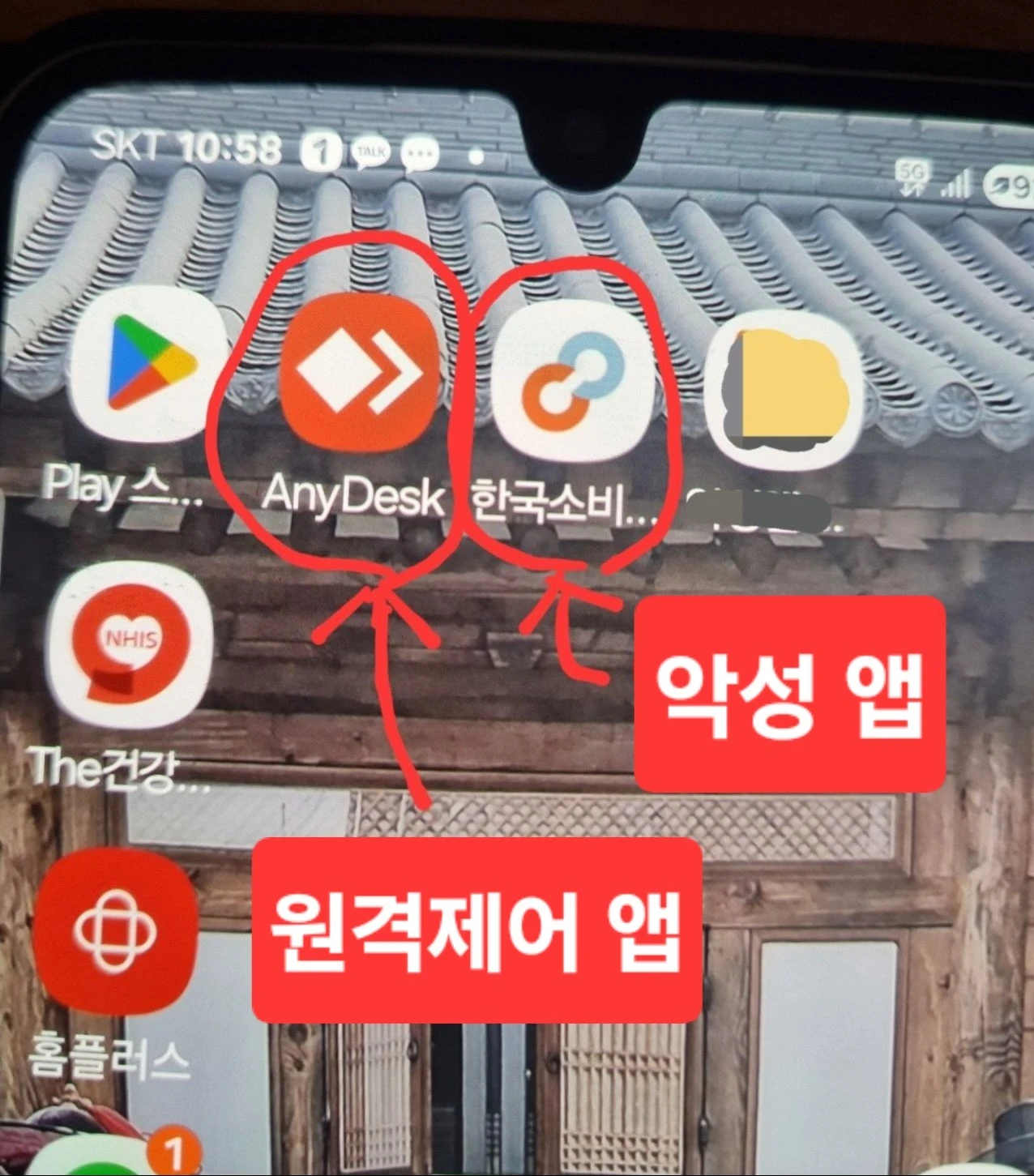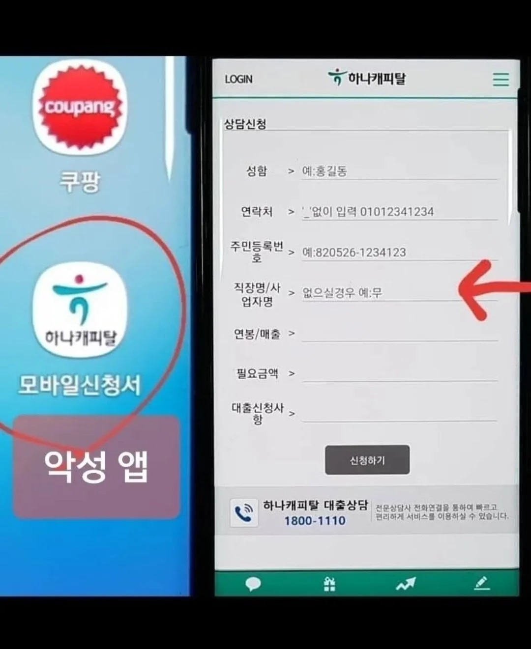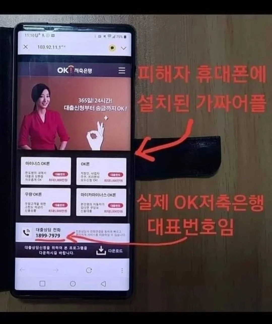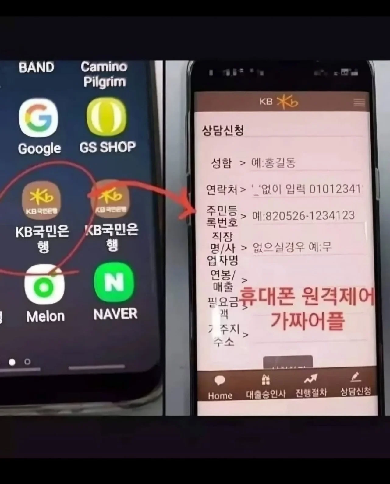 그리고 보이스피싱 범죄 조직의 구성원 또는 고용된 블랙해커가 만들어, 피해자의 휴대폰에 설치하게끔 하는 사진과 유사한 가짜 어플(악성 앱)을 휴대폰에 절대로 설치하시면 안 됩니다.