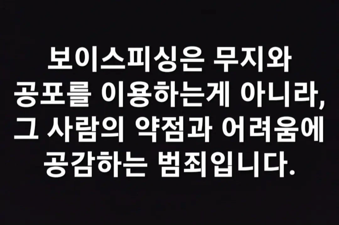 보이스피싱은 사람의 무지와 공포를 이용하는 범죄가 아니라, 범행 대상의 약점과 심리를 파고들어 피해자의 아픔에 공감하는 지능형 범죄입니다. 혹여나 피해를 당하신 분은 자신을 자책하지 않으셔도 됩니다.