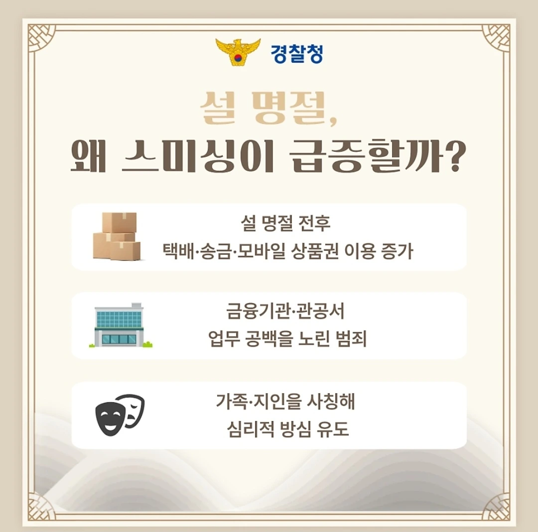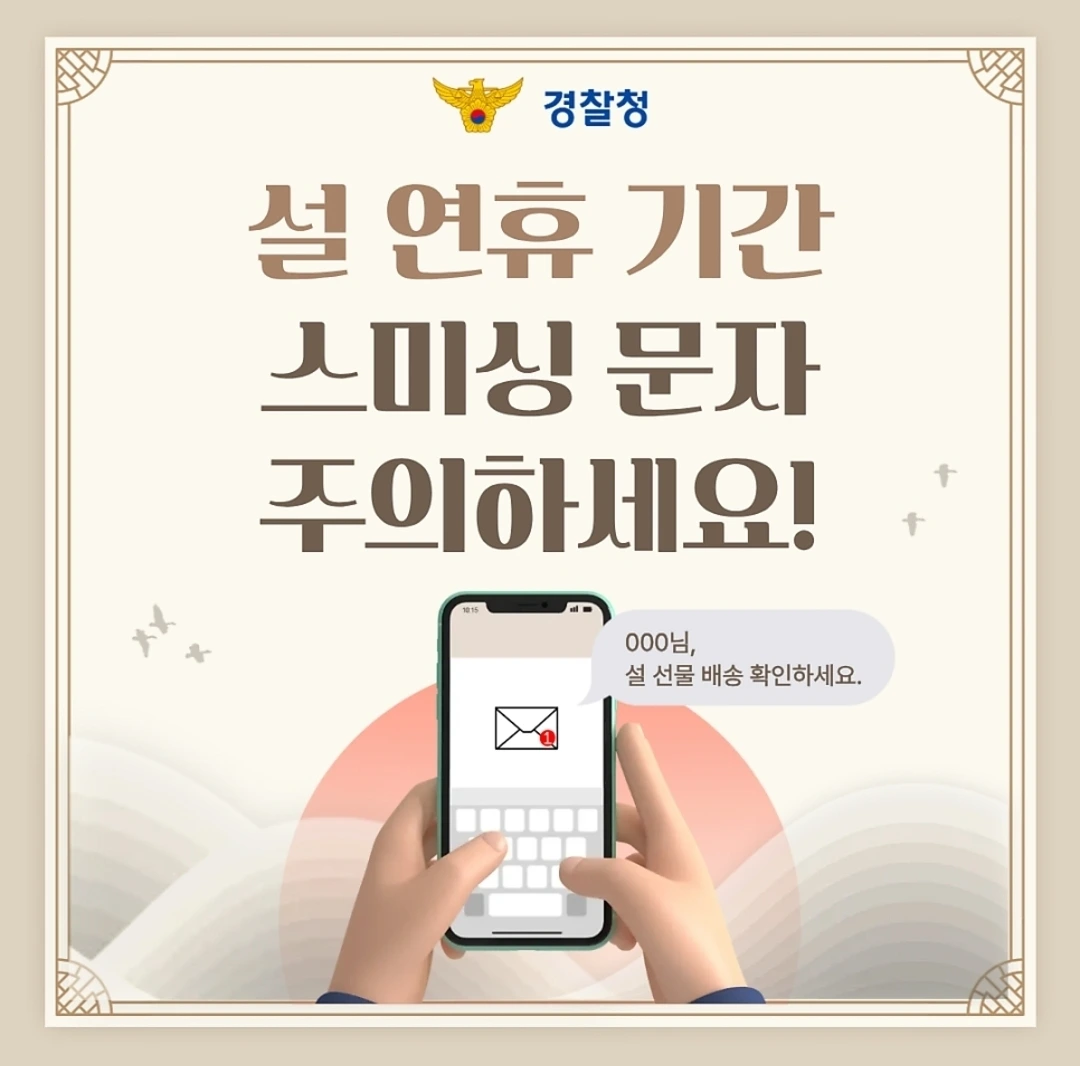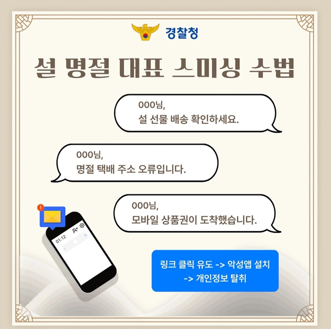 설 연휴를 앞두고 스미싱 피해 예방을 위한 관심 이 어느 때보다 중요합니다.