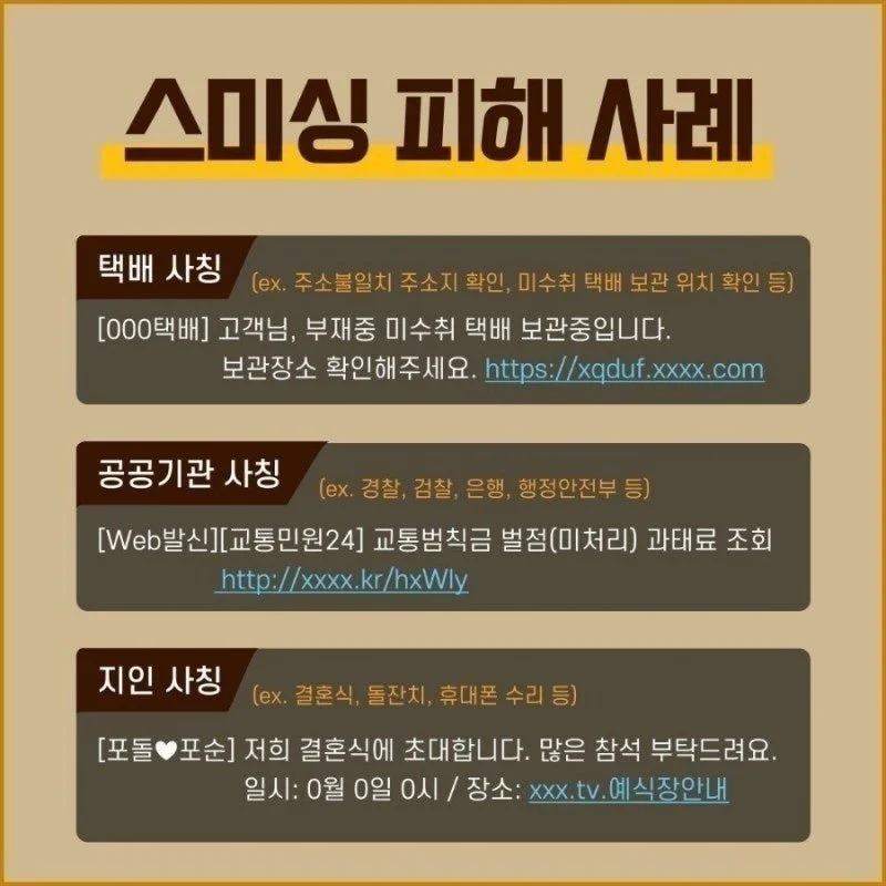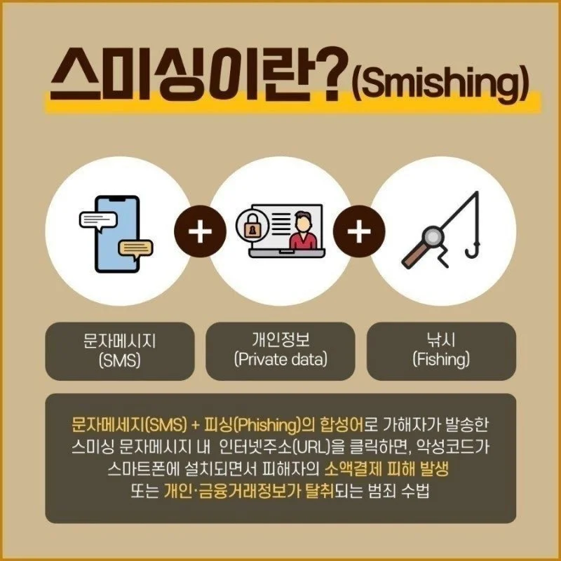 - 문자메세지(SMS) + 피싱(Phishing)의 합성어로 가해자가 발송한 스미싱 문자메시지 내 인터넷주소(URL)을 클릭하면,
