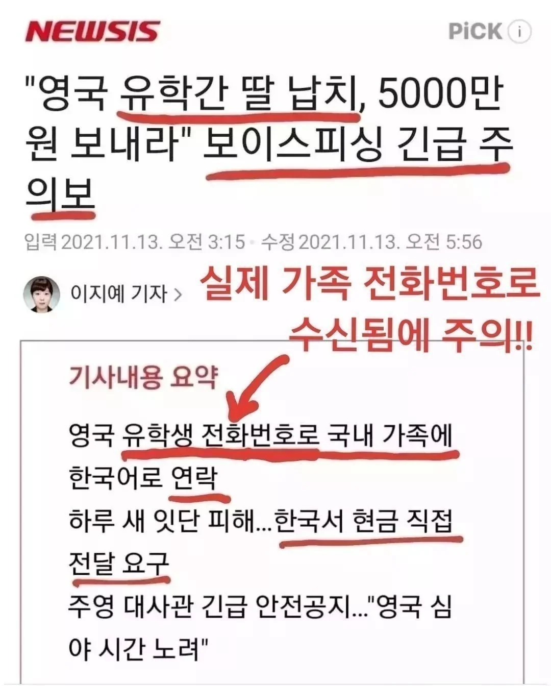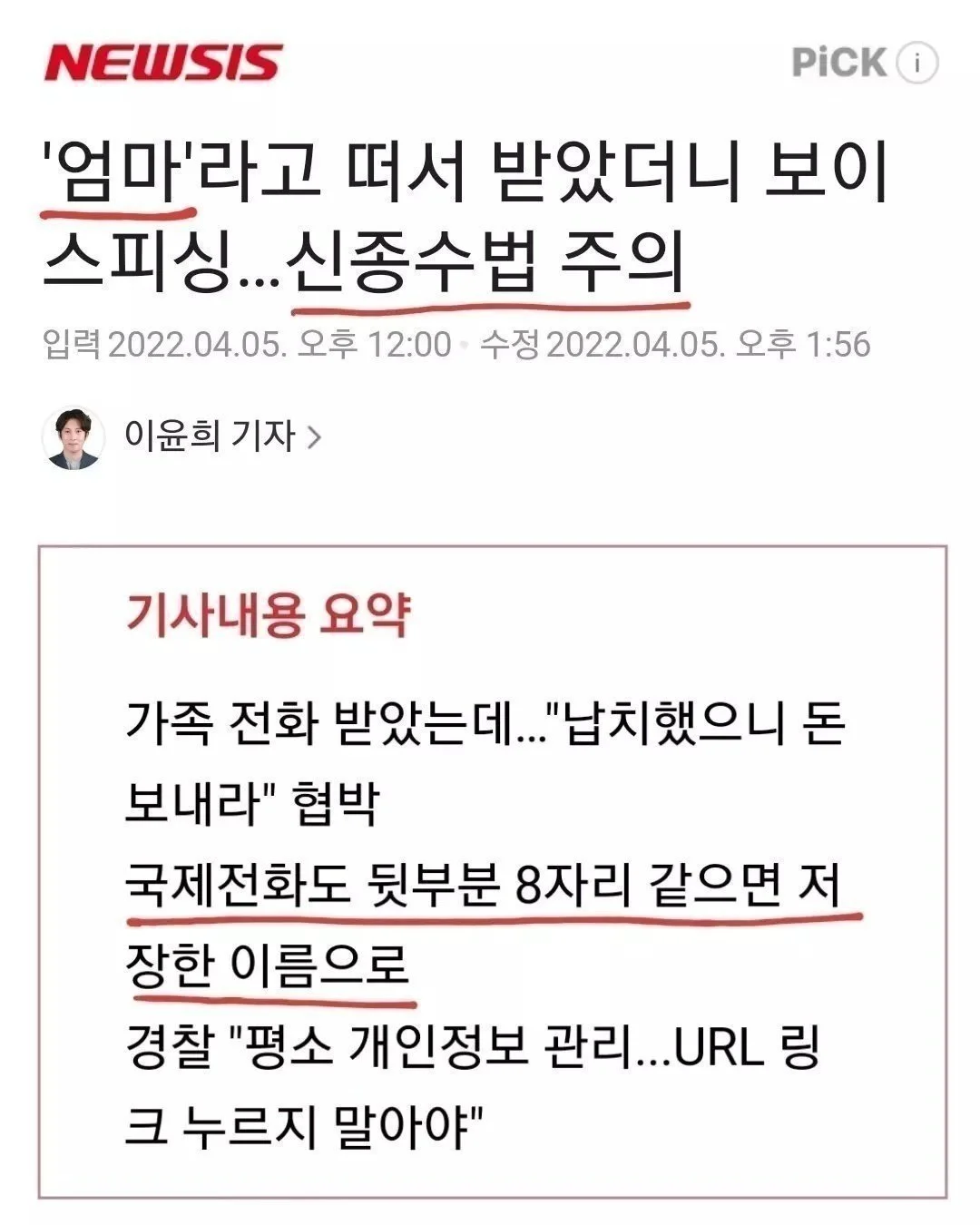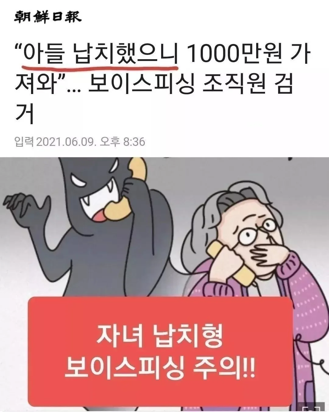 *어떻게 가장 가까운 가족의 목소리를 분간하지 못하냐고 생각하실 수도 있겠지만, 가족이 납치되었다는 의심과 함께 사람이 당황한 순간에는 울먹이는 가족의 목소리를 분간하지 못한다는 사람의 심리를 이용한 것입니다.
