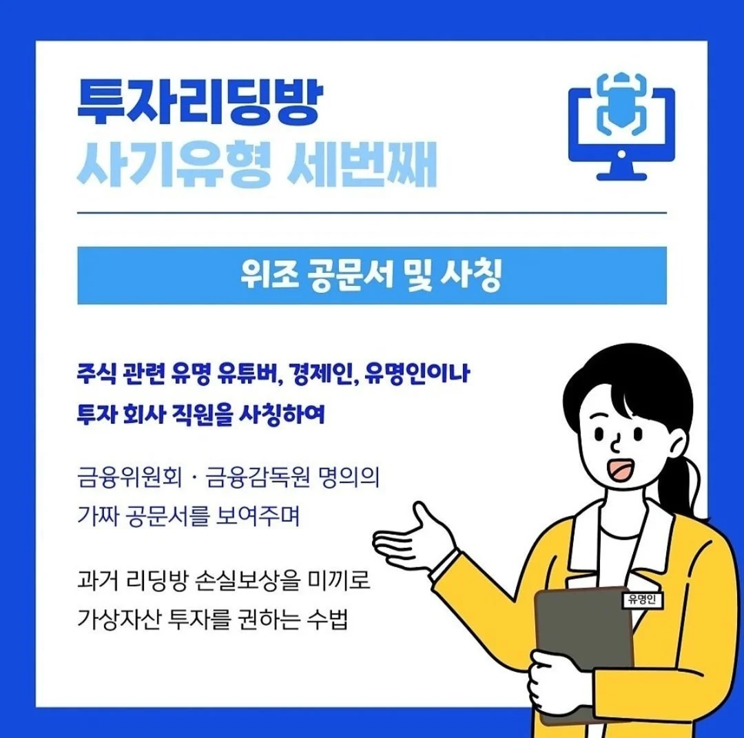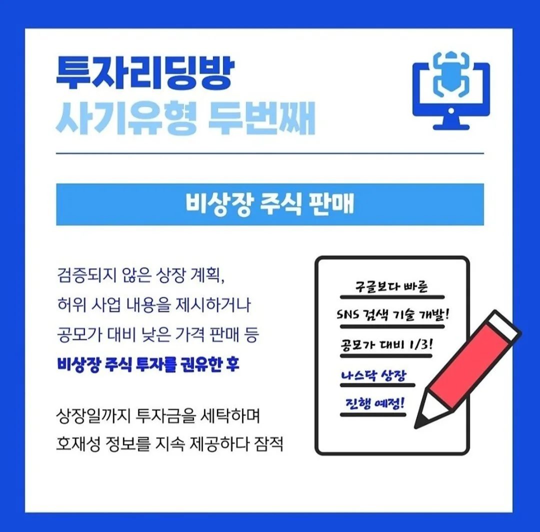 SNS, 오픈 채팅방 등을 통해 높은 수익률 보장 등 과장·허위 광고를 하며 투자자를 대상으로 한 불법행위가 급증하고 있습니다.