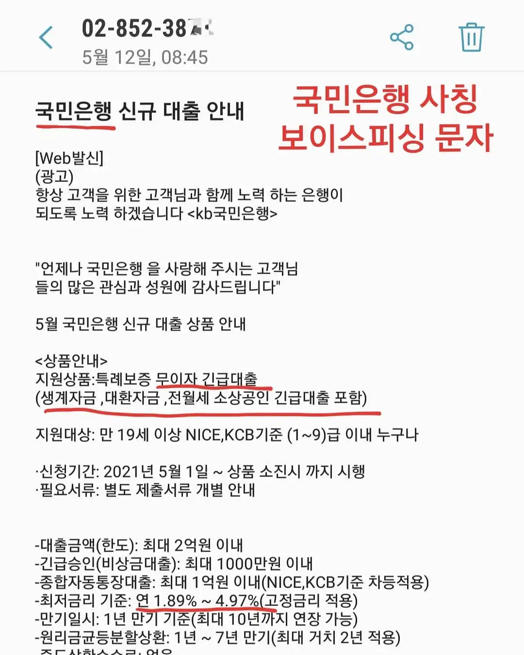 여러 은행의 상호와 저축은행, 캐피탈 상호를 번갈아 쓰며, 정상적인 대출 광고 문자와 거의 똑같아 구분이 어렵습니다. 문자의 끝부분에 대출 한도 조회와 상담 신청 '연락처 02-1234-5678'이라는 전화번호에 전화를 걸면 실제 은행으로 오인할 정도의 은행 안내 멘트가 나옵니다.
