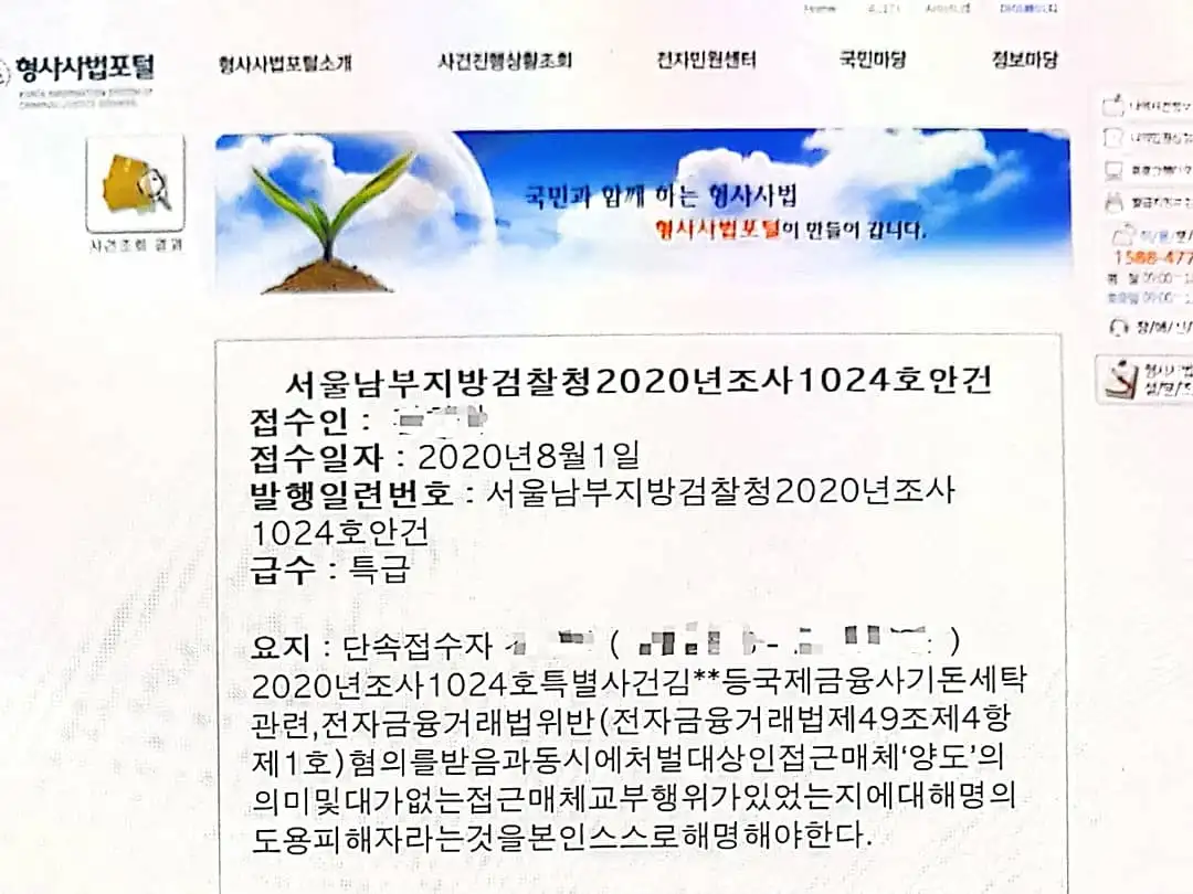 검찰청 '형사사법포털' 사이트에서 자신의 이름이 피의자로 올라가 있는 □□검찰청 '2021형제 12345호' 사건 내용을 눈으로 확인한 피해자는, 이때부터 극도의 두려움을 느끼게 되고, 당황하게 되어 이성적인 판단을 못 하게 되며 수사 협조라는 명목 하에 그들이 시키는 데로 귀신에 홀린 듯이 움직이게 됩니다.