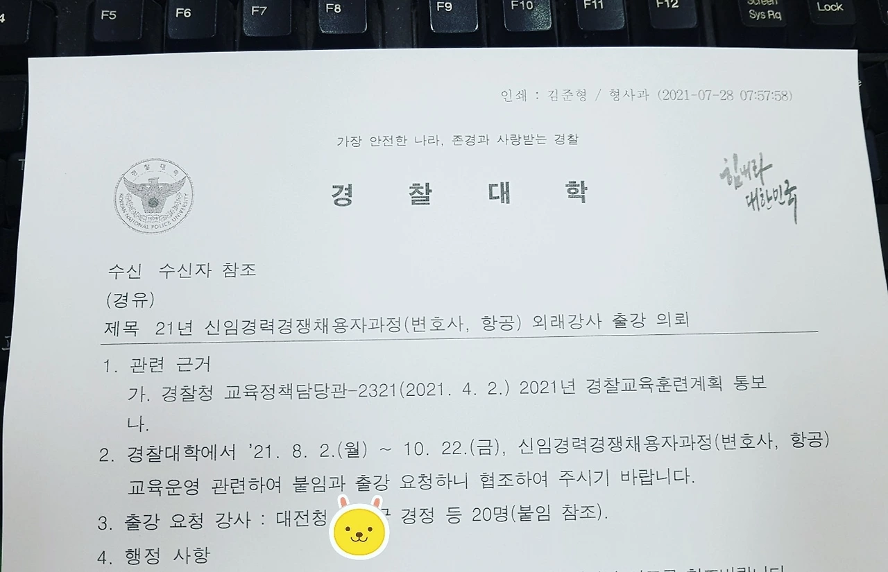 경찰대학으로부터 외래강사 출강 요청을 받았습니다.