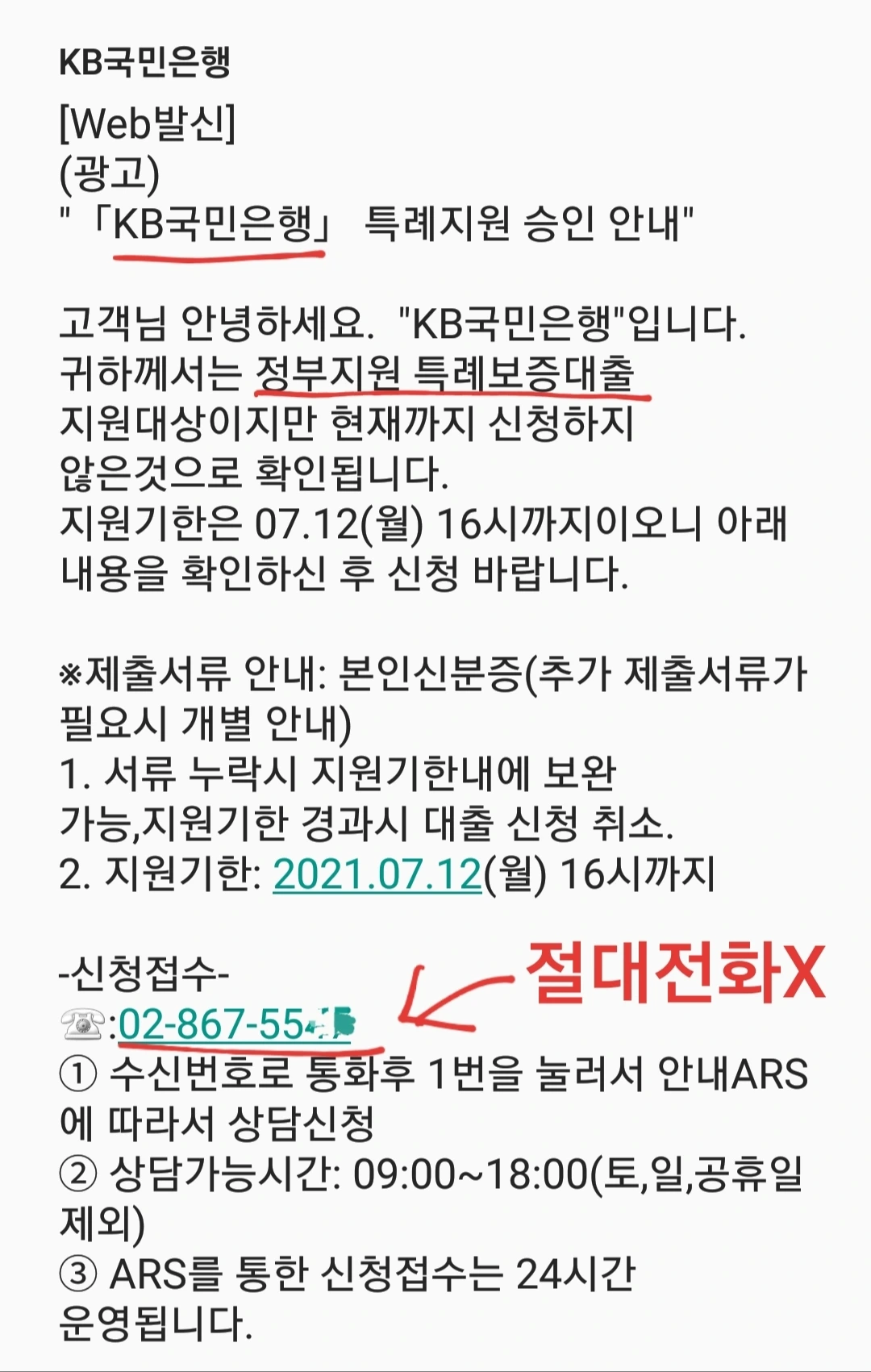 사진과 같이 저이율 대출이 가능하다는 문자메시지에 있는 상담신청 번호에 전화를 걸어, 자신의 휴대폰 번호를 절대 남기시면 안됩니다. 각별한 주의가 필요합니다.