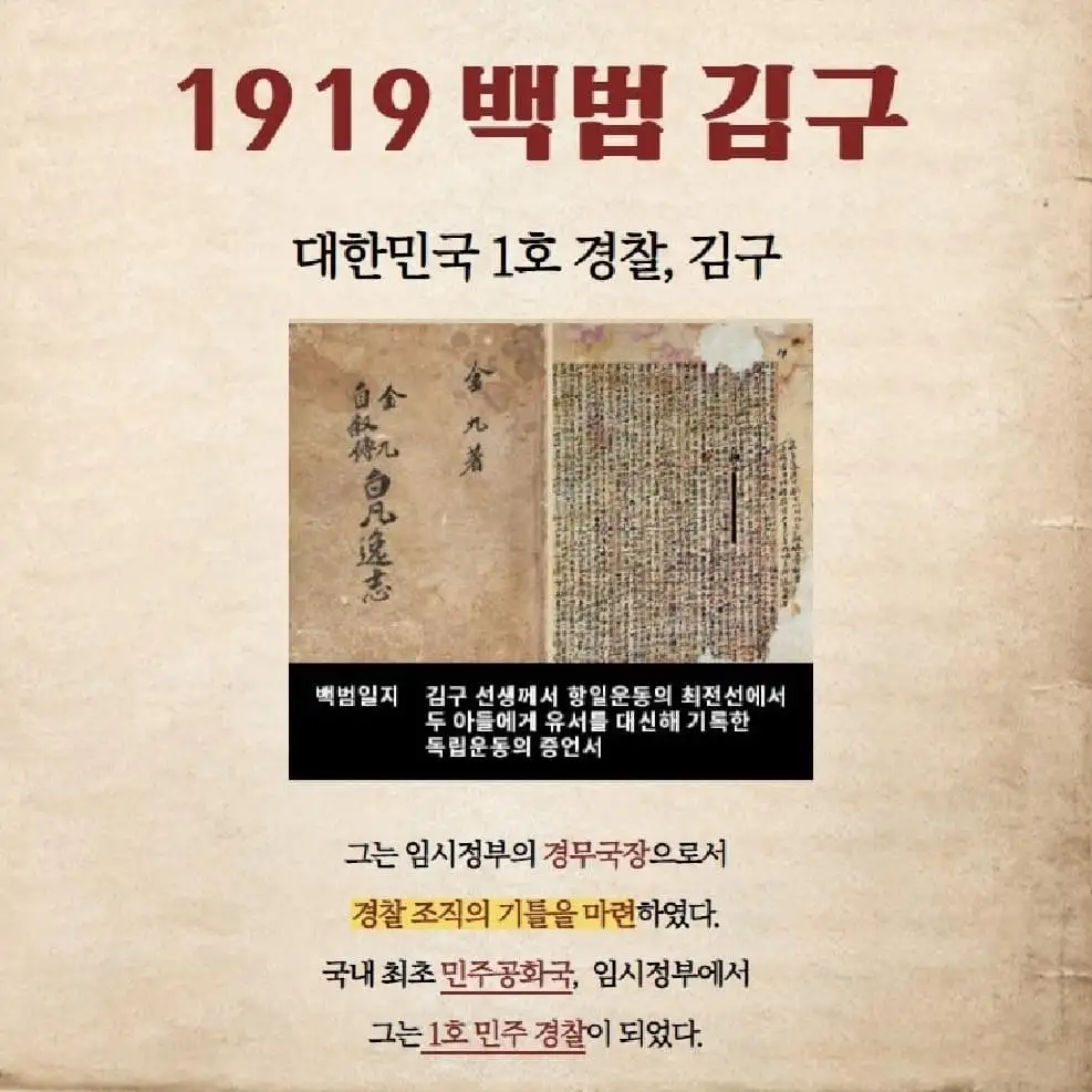 '1919년 백범 김구 선생 초대 경무국장이 되다. 그는 대한민국 1호 민주경찰이었다.'