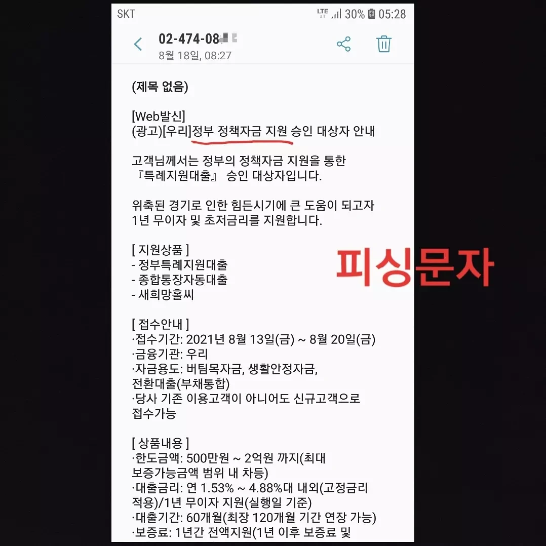 (정부지원 특례대출 / 긴급생계 지원자금 문자메시지)