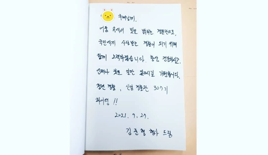 하얀 스케치와 같은 당신들이 언제나 국민들을 먼저 생각하며, 주민들에게 사랑받는 훌륭한 경찰관으로 성장하시는 모습을 기대하며 응원하겠습니다.