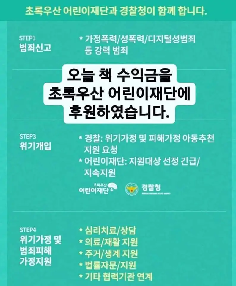 초록우산 재단은 우리 경찰청과 범죄피해 가정의 아동 및 아동학대 피해자 지원을 위한 업무협약을 체결한 곳이기도 합니다.