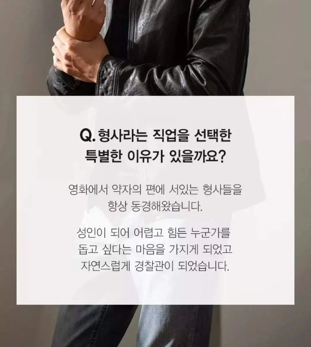 블루종은 군복이나 수렵가들이 주로 입는 점퍼로 알려져 있습니다. 이 점퍼가 삭막한 도시 생태계에서 '범죄자를 잡는 형사'라는 느낌과 연결되면서, 현직 형사인 제가 광고 모델을 하게 되었습니다.
