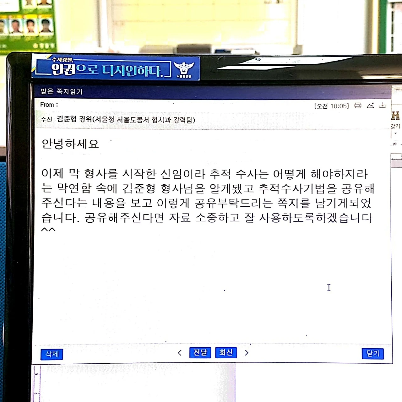 '대한민국 강력형사 1프로'를 꿈꾸시는 후배에게 쪽지를 받았습니다.