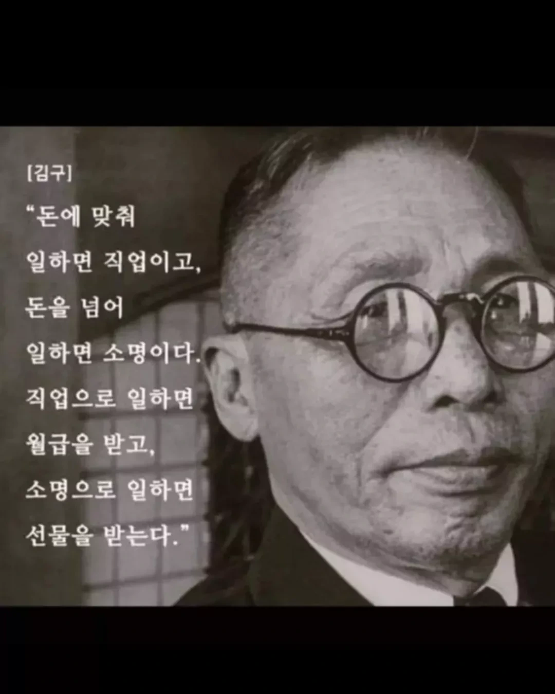 김구 선생께서는 '돈에 맞춰 일하면 직업이고, 돈을 넘어 일하면 소명이다. 직업으로 일하면 월급을 받고, 소명으로 일하면 선물을 받는다.'고 말씀하셨습니다.