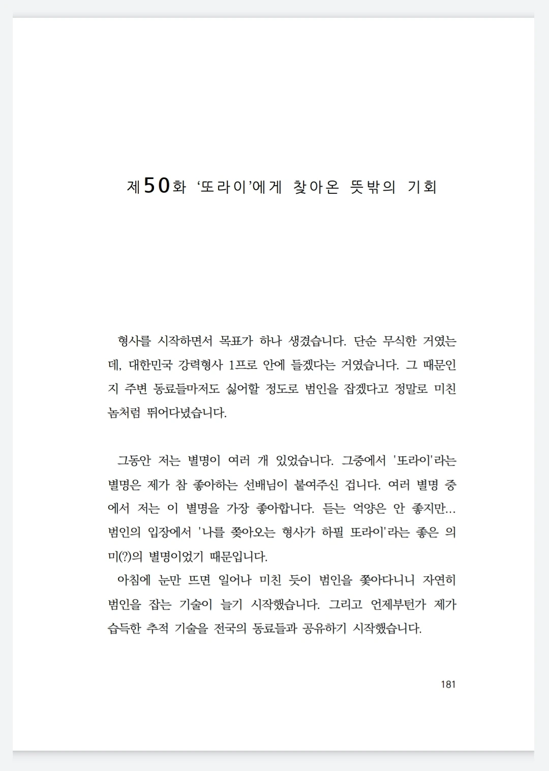 그동안 저는 별명이 여러 개 있었습니다. 그중에서 '또라이'라는 별명은 제가 참 좋아하는 선배님이 붙여주신 겁니다. 여러 별명 중에서 저는 이 별명을 가장 좋아합니다. 듣는 억양은 안 좋지만... 범인의 입장에서 '나를 쫒아오는 형사가 하필 또라이'라는 좋은 의미(?)의 별명이었기 때문입니다.