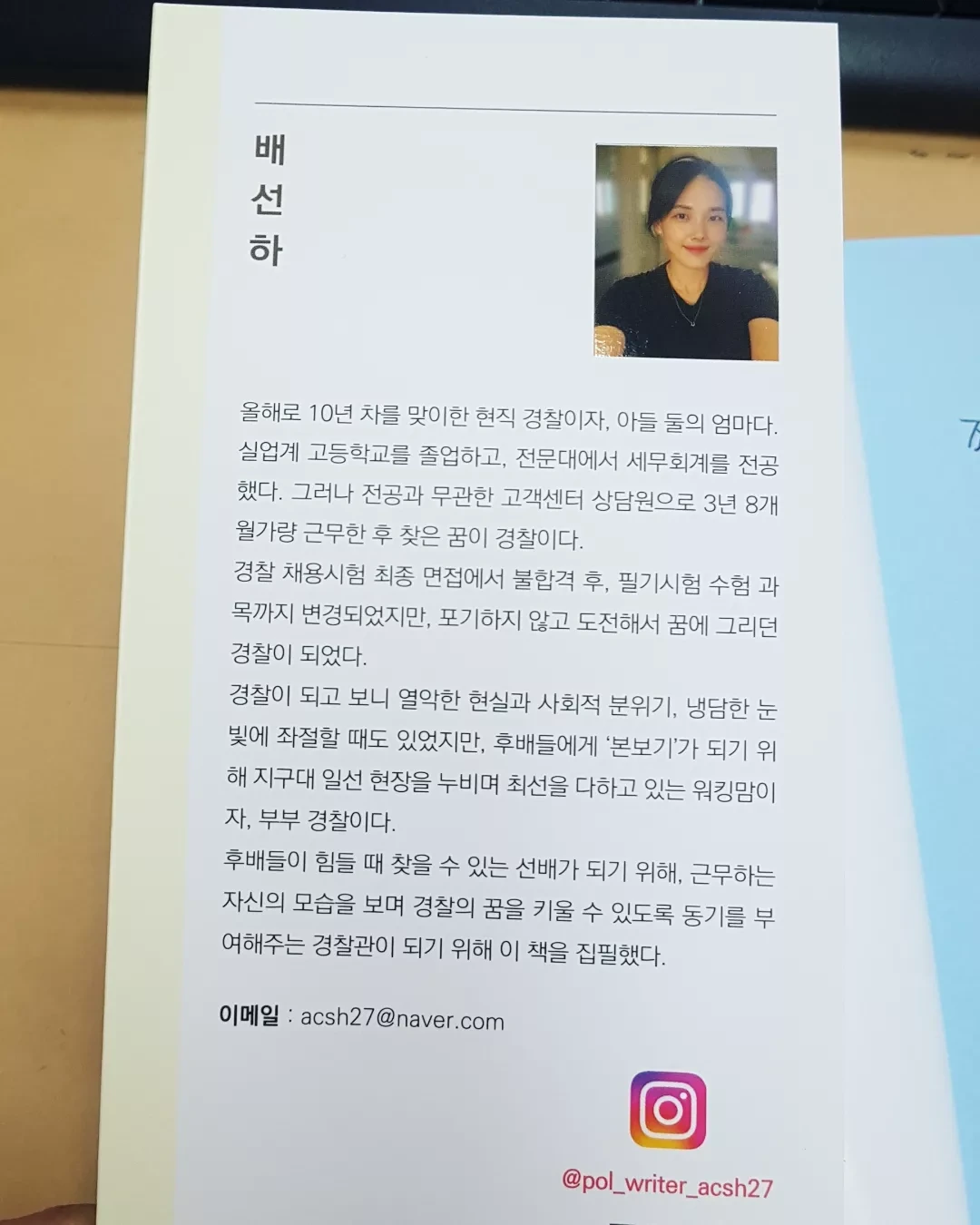 10년 차 경찰관이자, 아들 둘 워킹맘이자 부부경찰인 배선하 후배님의 따끈따끈한 책입니다.