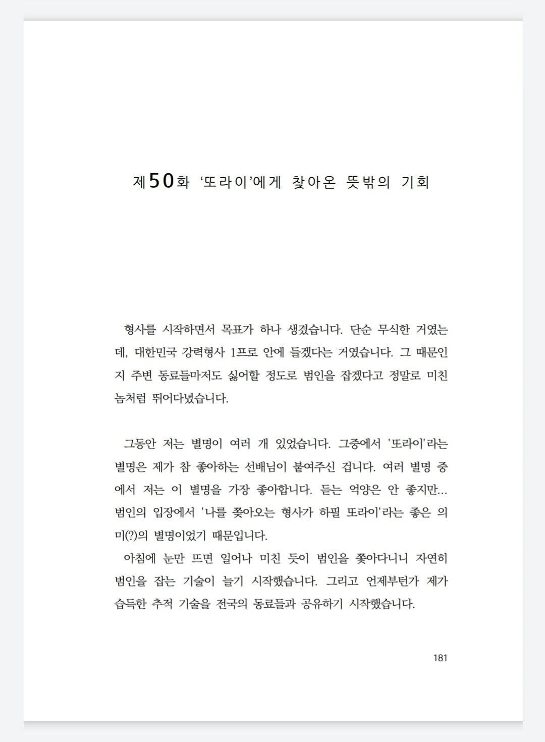 그동안 저는 별명이 여러 개 있었습니다. 그중에서 '또라이'라는 별명은 제가 참 좋아하는 선배님이 붙여주신 겁니다. 여러 별명 중에서 저는 이 별명을 가장 좋아합니다. 듣는 억양은 안 좋지만... 범인의 입장에서 '나를 쫒아오는 형사가 하필 또라이'라는 좋은 의미(?)의 별명이었기 때문입니다.