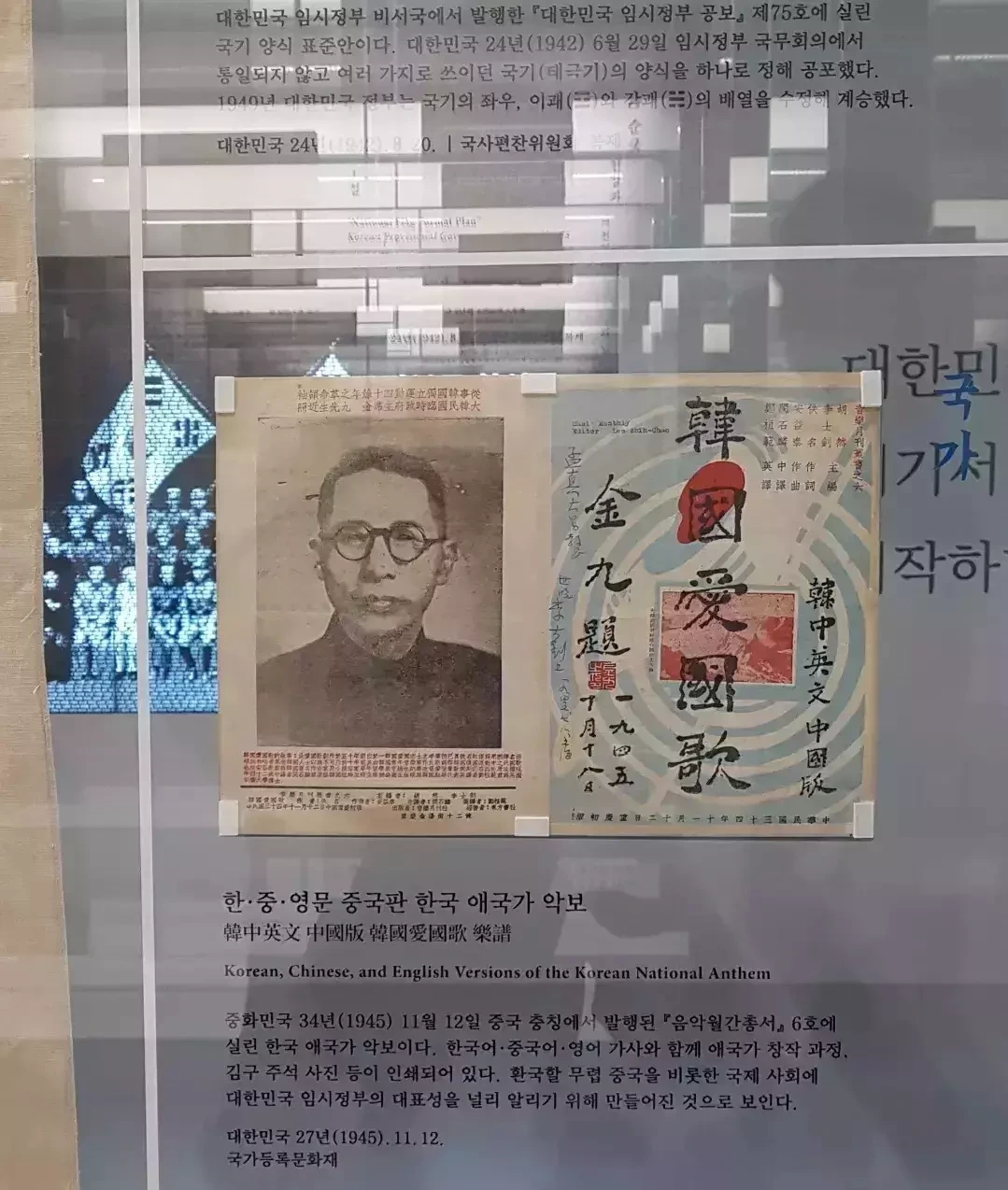 3층에 전시된 한국 애국가 악보에는 김구 주석의 사진이 인쇄되어 있었습니다. 백범 김구 선생은 1919년 초대 경무국장으로 임시정부 경찰의 기틀을 확립하였고, 우리 역사상 최초 민주공화제였던 대한민국 임시정부의 1호 민주경찰이기도 합니다.