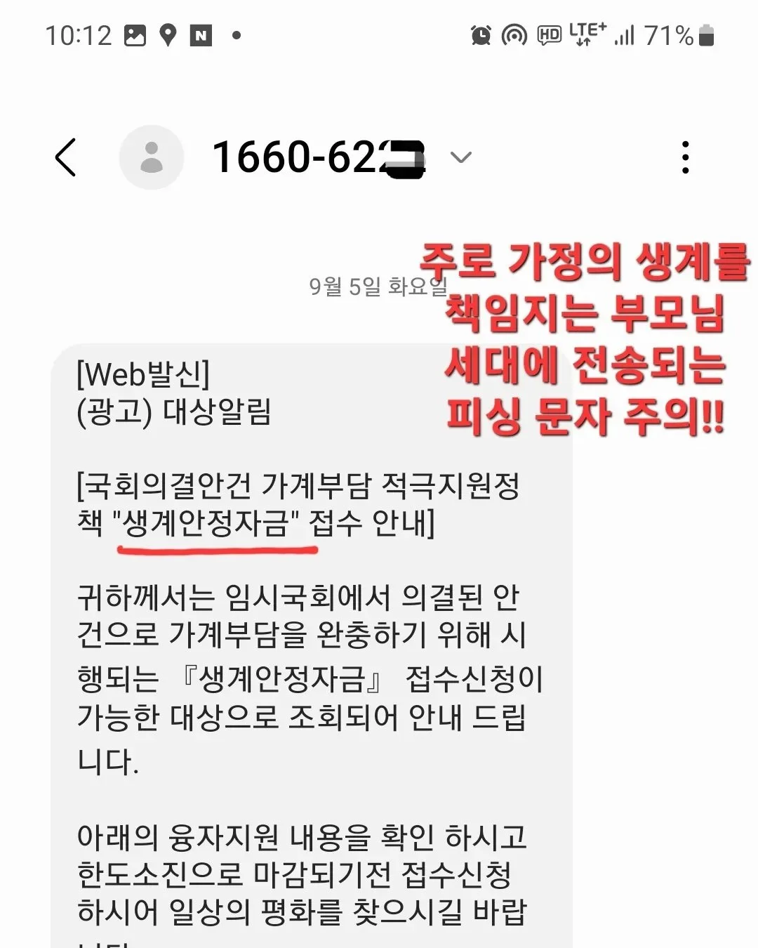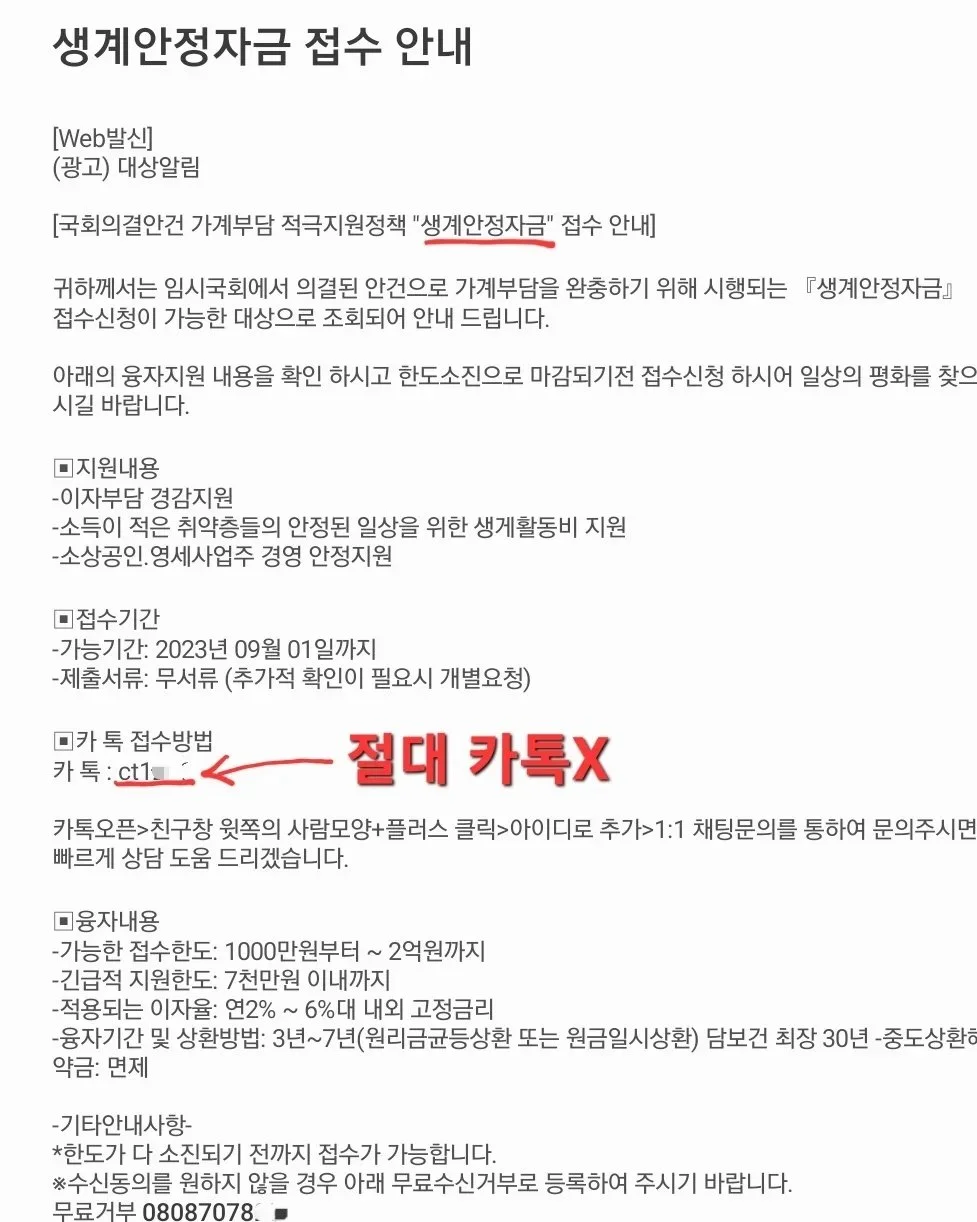 오늘 전송되고 있는정부지원 '서민대출ㆍ특례대출' 보이스피싱 문자메시지 입니다. 캐피탈 등 제2,3 금융권 대출이 있거나, 코로나 등으로 인해 경제적으로 어려운 서민과 소상공인들에게 은행권 1~3프로대의 '초저이율 대출'을 해 주겠다는 기망 수법입니다. 하단의 번호에 절대 전화를 걸거나, 카톡을 하시면 안됩니다. 전화가 연결되면 내 휴대폰 번호가 피싱범에게 넘어갑니다. 각별한 주의가 필요합니다.