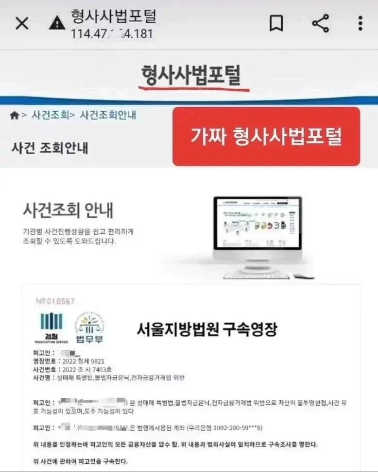 그러면서 문자메시지나 카톡으로 가짜 검찰청 사이트에 연결되는 URL접속 주소를 보내, 지금 당장 본인의 이름과 주민번호를 넣고 지금 내가(검사) 하는 말이 사실인지, 아니면 거짓인지를 본인의 사건을 조회해 보라고 시키게 되고,