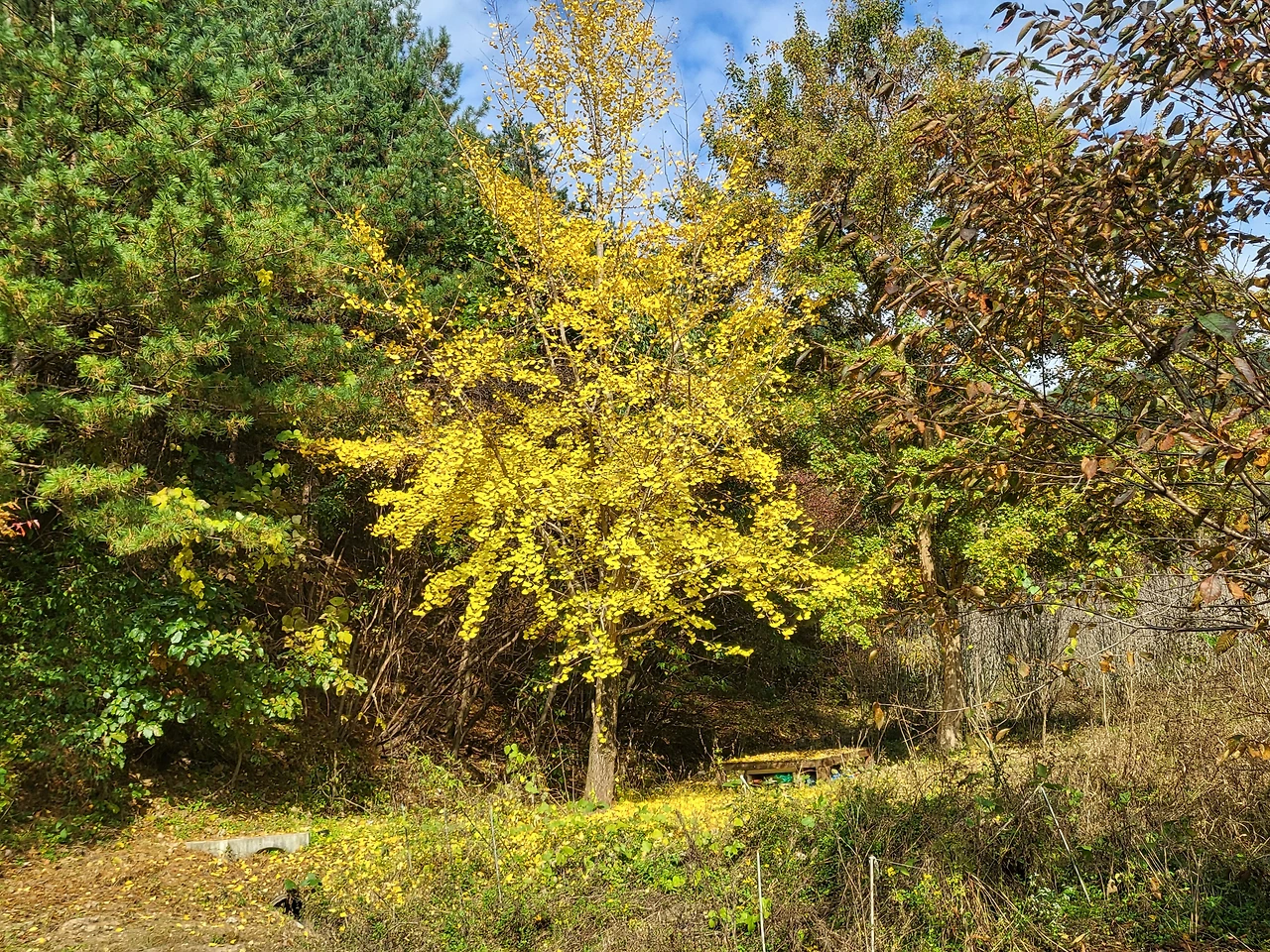 바닥엔 그동안 떨구어낸 달콤한 색감의 은행잎이 한가득이네.