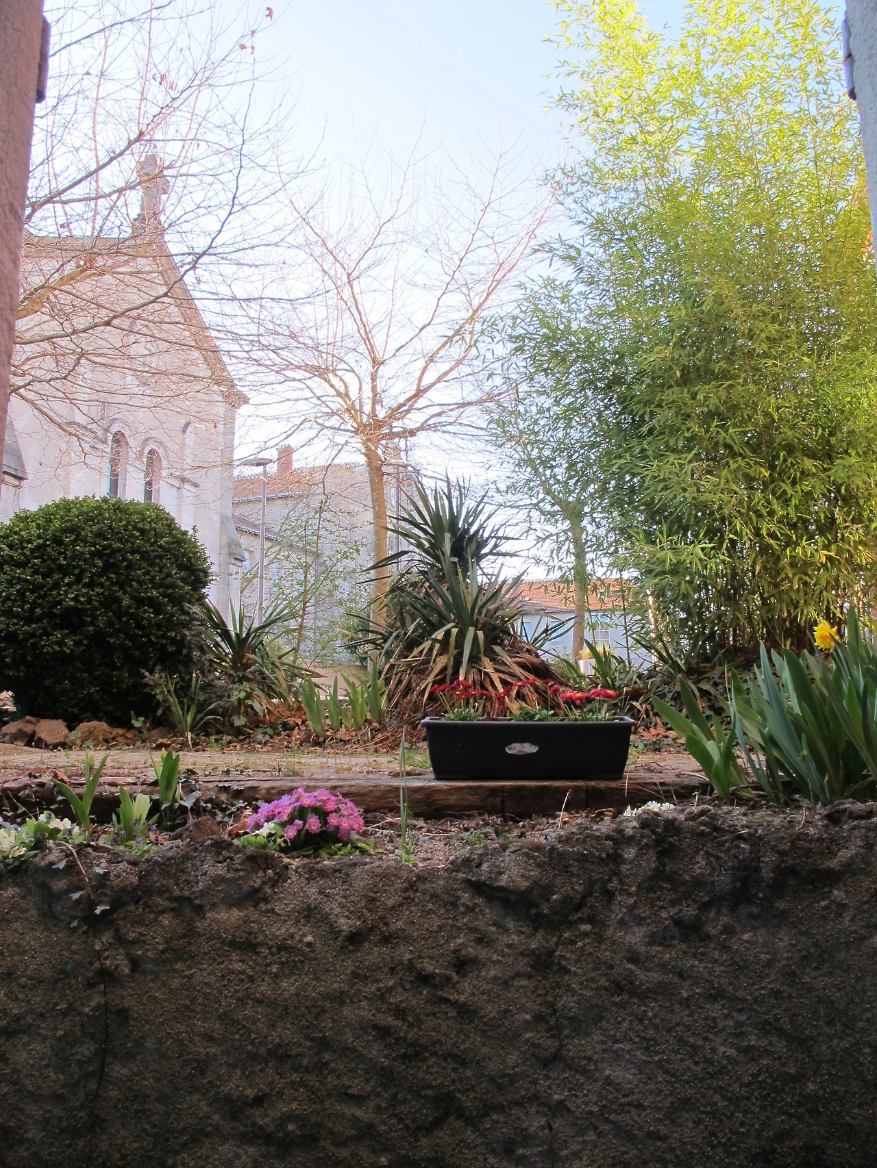 아파트형 호텔과 다인실을 함께 운영하는 마을 외곽 숙소( Appart' Hotel Des Capucins SARL)에 짐을 풀었다. 도서전 준비를 하느라 더 가벼워진 주머니 덕분에 내 자리는 호텔이 아닌 마당 한쪽에 있는 별채 4인실이었는데 이층 침대 두 개만 덜렁 놓여있는 반지하 방에도 낭만적인 구석은 있었다. 정원으로 난 창의 덧문을 열면 눈높이에 수선화와 이름 모를 작은 꽃들이 피어있는 화단이 보이고 그 나머지 공간은 푸른 하늘로 채워졌다. 마치 풀잎을 지붕 삼아 사는 작은 생물이 되어 하늘을 올려다보는 기분이었다.