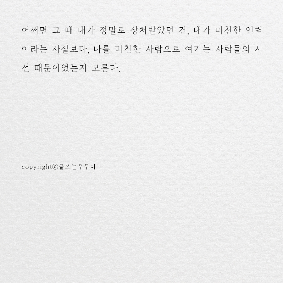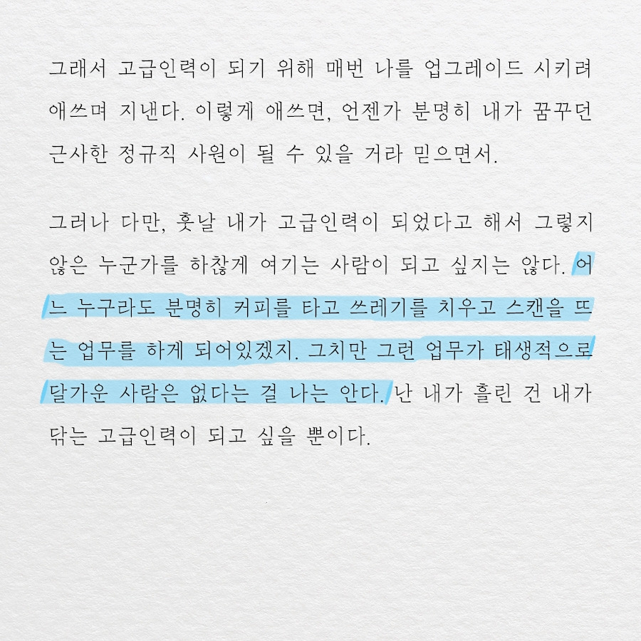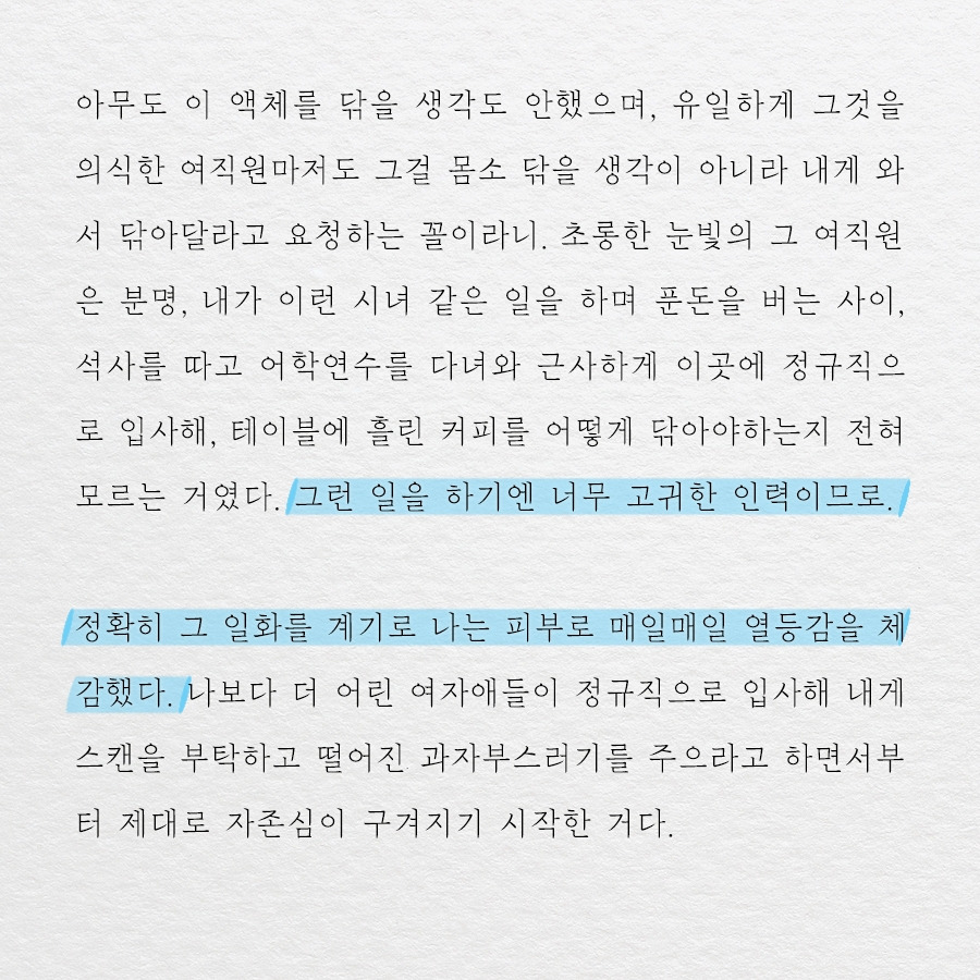 그러나 다만, 훗날 내가 고급인력이 되었다고 해서 그렇지 않은 누군가를 하찮게 여기는 사람이 되고 싶지는 않다. 어느 누구라도 분명히 커피를 타고 쓰레기를 치우고 스캔을 뜨는 업무를 하게 되어있겠지. 그치만 그런 업무가 태생적으로 달가운 사람은 없다는 걸 나는 안다. 난 내가 흘린 건 내가 닦는 고급인력이 되고 싶다. 어쩌면 그 때 내가 정말로 상처받았던 건, 내가 미천한 인력이라는 사실보다, 나를 미천한 사람으로 여기는 사람들의 시선 때문이었는지 모른다.