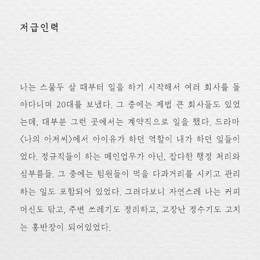 나는 스물두 살 때부터 일을 하기 시작해서 여러 회사를 돌아다니며 20대를 보냈다. 그 중에는 제법 큰 회사들도 있었는데, 대부분 그런 곳에서는 계약직으로 일을 했다. 드라마 <나의 아저씨>에서 아이유가 하던 역할이 내가 하던 일들이었다. 정규직들이 하는 메인업무가 아닌, 잡다한 행정 처리와 심부름들. 그 중에는 팀원들이 먹을 다과거리를 시키고 관리하는 일도 포함되어 있었다. 그러다보니 자연스레 나는 커피머신도 닦고, 주변 쓰레기도 정리하고, 고장난 정수기도 고치는 홍반장이 되어있었다.