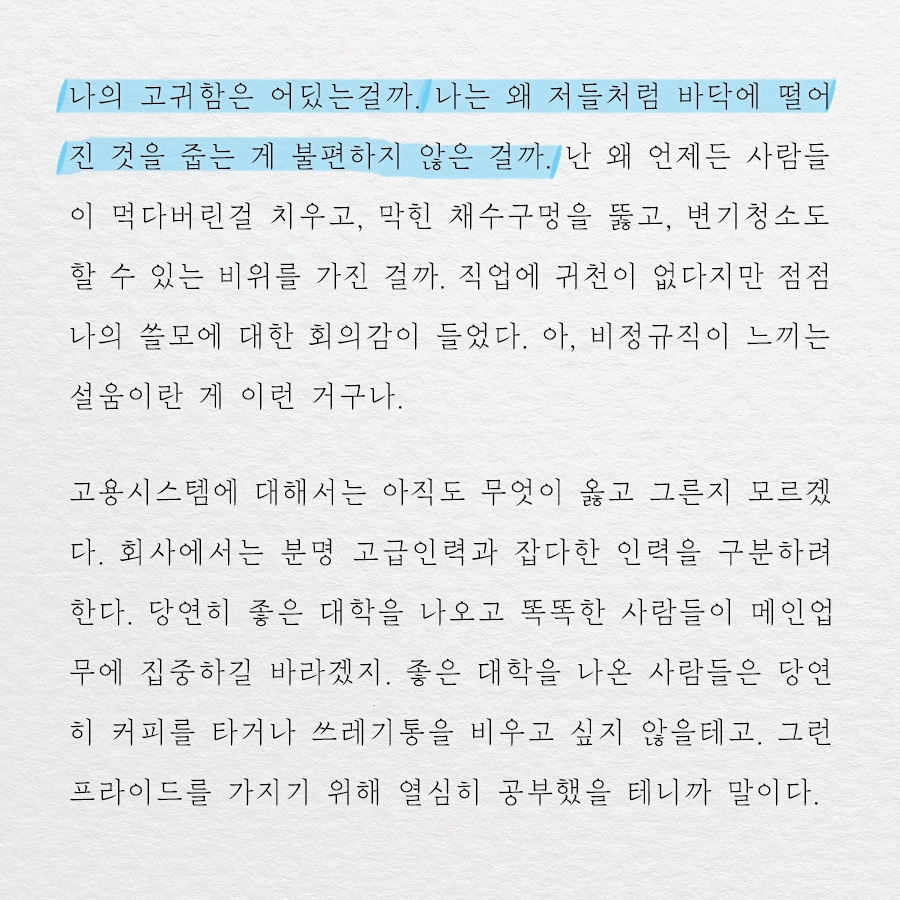 나의 고귀함은 어딨는걸까. 나는 왜 저들처럼 바닥에 떨어진 것을 줍는 게 불편하지 않은 걸까. 난 왜 언제든 사람들이 먹다버린걸 치우고, 막힌 채수구멍을 뚫고, 변기청소도 할 수 있는 비위를 가진 걸까. 직업에 귀천이 없다지만 점점 나의 쓸모에 대한 회의감이 들었다. 아, 비정규직이 느끼는 설움이란 게 이런 거구나.