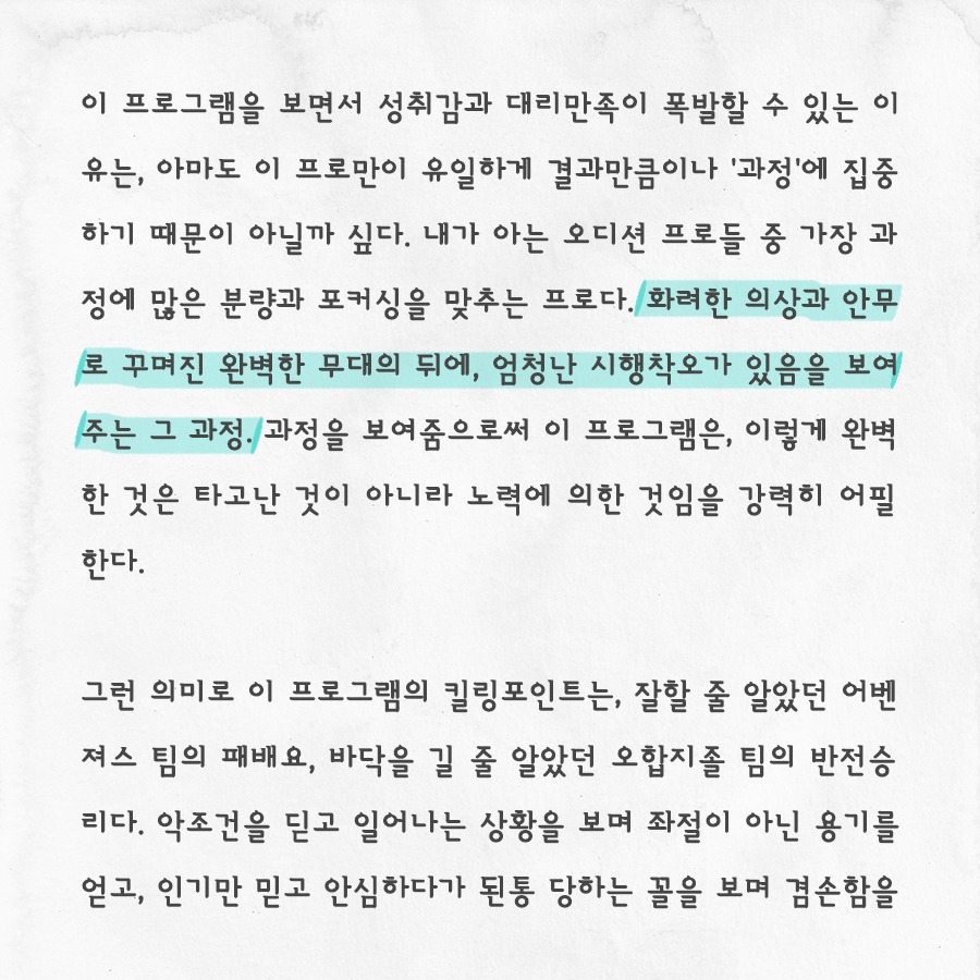 그런 의미로 이 프로그램의 킬링포인트는, 잘할 줄 알았던 어벤져스 팀의 패배요, 바닥을 길 줄 알았던 오합지졸 팀의 반전승리다. 악조건을 딛고 일어나는 상황을 보며 좌절이 아닌 용기를 얻고, 인기만 믿고 안심하다가 된통 당하는 꼴을 보며 겸손함을 배우기도 한다. 하지만 그 두 경우 모두 결국 한 가지 가르침으로 귀결된다. 노력하면 된다는 것. 이 '노력하면 된다'는 프레임을 통해, 방송을 보는 시청자들은 불가능한 꿈에 다가갈 열정을 얻는 게 아닐까. 울고불고 포기하다가 일어서서 연습하고 결국엔 완벽한 무대를 꾸미는 모습을 통해, 나 또한 엄청난 대리만족을 하고 있다.