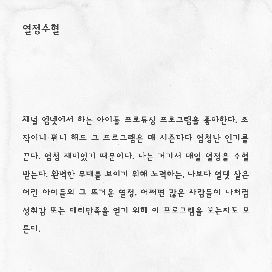 채널 엠넷에서 하는 아이돌 프로듀싱 프로그램을 좋아한다. 조작이니 뭐니 해도 그 프로그램은 매 시즌마다 엄청난 인기를 끈다. 엄청 재미있기 때문이다. 나는 거기서 매일 열정을 수혈 받는다. 완벽한 무대를 보이기 위해 노력하는, 나보다 열댓 살은 어린 아이들의 그 뜨거운 열정. 어쩌면 많은 사람들이 나처럼 성취감 또는 대리만족을 얻기 위해 이 프로그램을 보는지도 모른다.