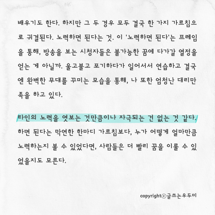 타인의 노력을 엿보는 것만큼이나 자극되는 건 없는 것 같다. 하면 된다는 막연한 한마디 가르침보다 누가 어떻게 얼마만큼 노력하는지 볼 수 있었다면, 사람들은 더 빨리 꿈을 이룰 수 있었을지도 모른다.
