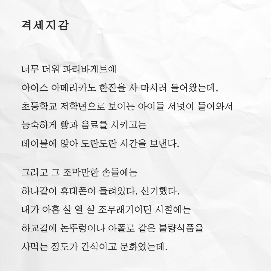 신기했다. 내가 아홉 살 열 살 조무래기이던 시절에는 하교길에 논뚜렁이나 아폴로 같은 불량식품을 사먹는 정도가 간식이고 문화였는데. 또 휴대폰이 웬 말인가, 서로의 집 전화번호를 외워다가 “아주머니, 수진이 좀 바꿔주세요”라고 하는 게 전화문화의 전부였다.